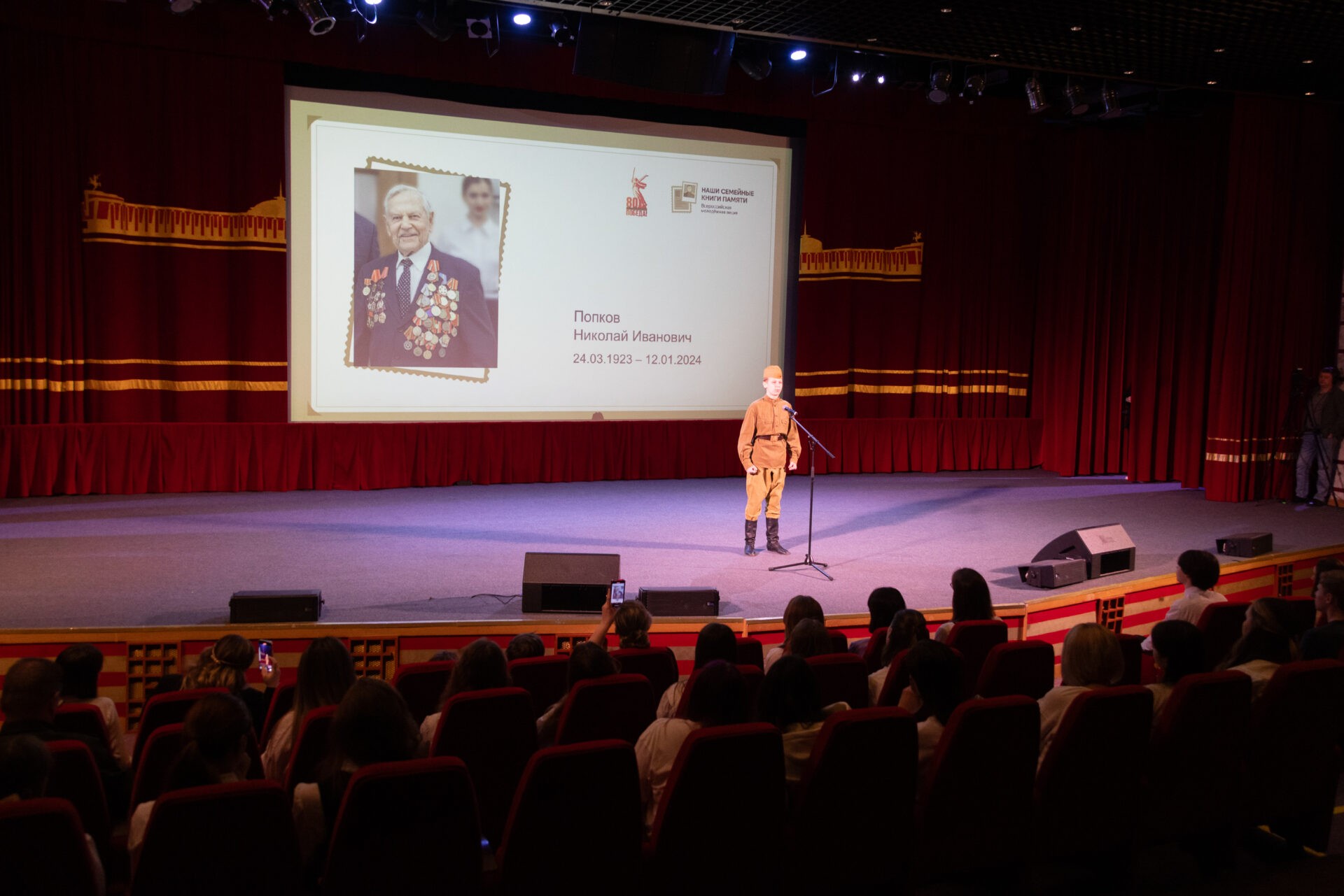 «Я рассказал о ветеране Великой Отечественной войны Николае Ивановиче Попкове. Он — кавалер двоих орденов Красной Звезды, ордена Отечественной войны 1-й степени, обладатель медали «За отвагу». Он воевал на Орловщине, под Сталинградом, на Курской дуге. Затем со своими воинами, со своими братьями они освобождали Брянск, Гомель и другие белорусские земли, где Николай Иванович был тяжело ранен, он мечтал дожить до 80-летия Победы, но в прошлом году, на 101-м году его жизни, его не стало», — поделился ученик гимназии № 4 города Курска Дмитрий Трубников.