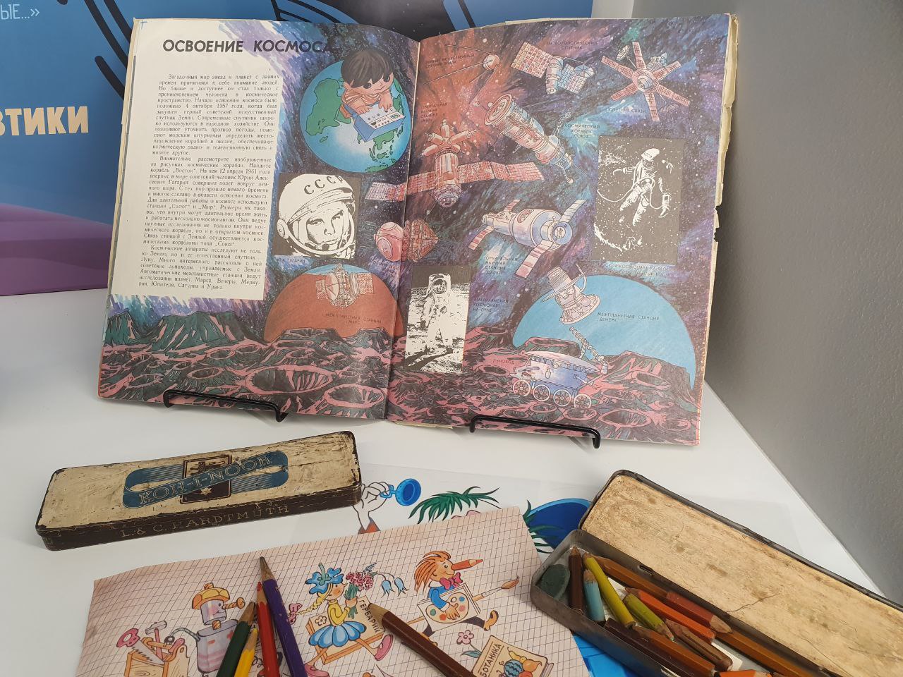 Среди наиболее интересных экспонатов — раритетные коробки из-под карандашей фирм Koh-i-Noor и Faber-Castell. На выставке показали марки и значки, посвященные теме космоса. Посетители увидели фотографии с автографами первых двух советских космонавтов: Юрия Гагарина и Алексея Леонова. Дополнили временную экспозицию газетные статьи о первом полете человека в космос и о выводе межпланетной станции на орбиту Венеры.
