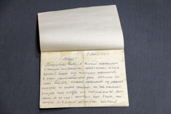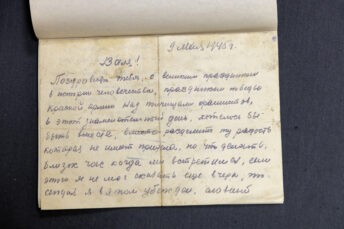 «Валя! Поздравляю тебя с великим праздником в истории человечества, праздником победы Красной армии над полчищами фашистов, в этот знаменательный день, хотелось бы быть вместе, вместе разделить ту радость, которая не имеет придела, но что делать, близок час, когда мы встретимся, если этого я не мог сказать ещё вчера, то сегодня я в этом убеждён. Славный путь побед, от родных границ почти до границ Франции, орошён кровью. Но раны зажили, организм здоров, пусть наши враги убедятся в том, что единственной непобедимой армией мира есть наша Красная армия. Привет твоим боевым друзьям. До скорой встречи. Твой отец. 8 часов утра» (пунктуация и орфография автора сохранены. — Прим. ред.).