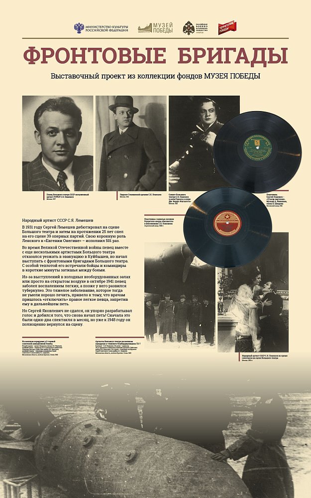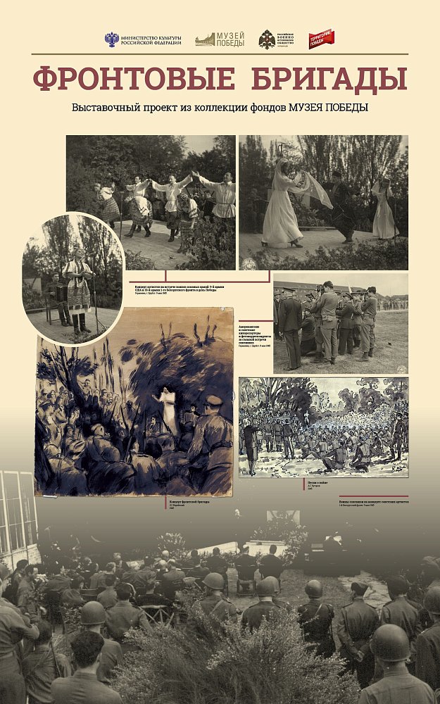 На выставке «Фронтовые бригады» посетителей познакомят с деятелями искусства, внесшими огромный вклад в разгром врага в годы Великой Отечественной войны. Тысячи драматических актеров, певцов, танцоров, музыкантов, композиторов, художников находились во время войны во фронтовых бригадах, военных клубах, в госпиталях, в санитарных поездах. Посетителям представят более 90 фотографий, афиш, картин и снимков экспонатов из фондов Музея Победы. Зрителям покажут редкие кадры первой фронтовой бригады, начавшей выступления уже летом 1941 года. Посетителям представят уникальные снимки Любови Орловой, Клавдии Шульженко, Сергея Лемешева, Леонида Утесова и многих других знаменитых артистов.
