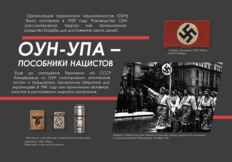 «Выставка «Обыкновенный нацизм» рассказывает о преступлениях украинских националистов в годы Второй мировой войны, о кровавых расправах над мирными жителями, совершенных нацистами и их приспешниками. В выставку вошли материалы об истории Организации украинских националистов (ОУН) и Украинской повстанческой армии (УПА), о дивизии СС «Галичина», националистических батальонах «Нахтигаль» и «Роланд», о Волынской резне. Посетителям представят статистику о количестве жертв среди мирного населения в годы Великой Отечественной», — отметили в Музее Победы.