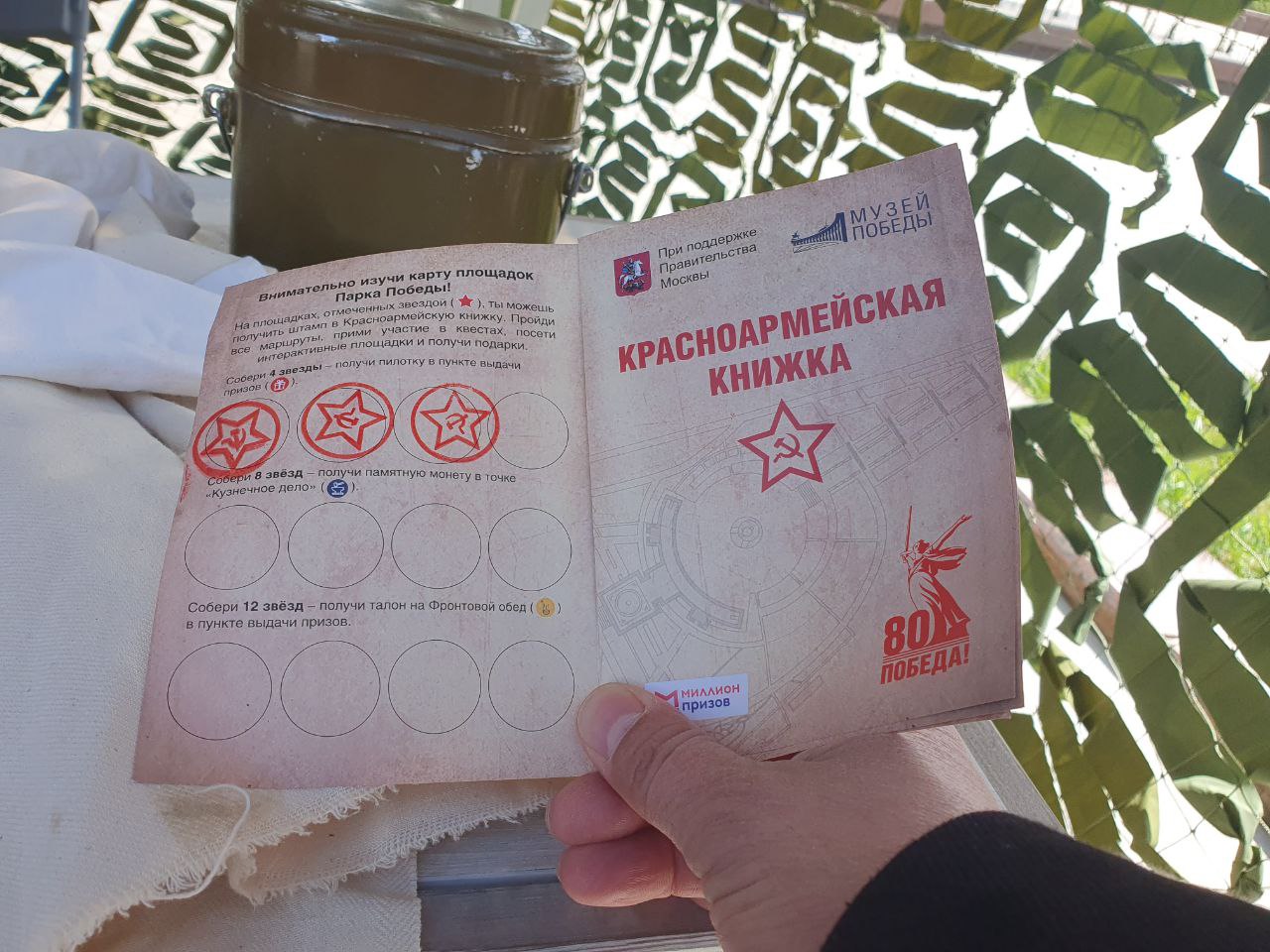 Кроме того, посетители парка уже подключились к семейному квесту «Вперед к Победе». Участники собирают в стилизованную «Красноармейскую книжку» штампы-звездочки на интерактивных площадках. Самые активные смогут получить памятные призы.