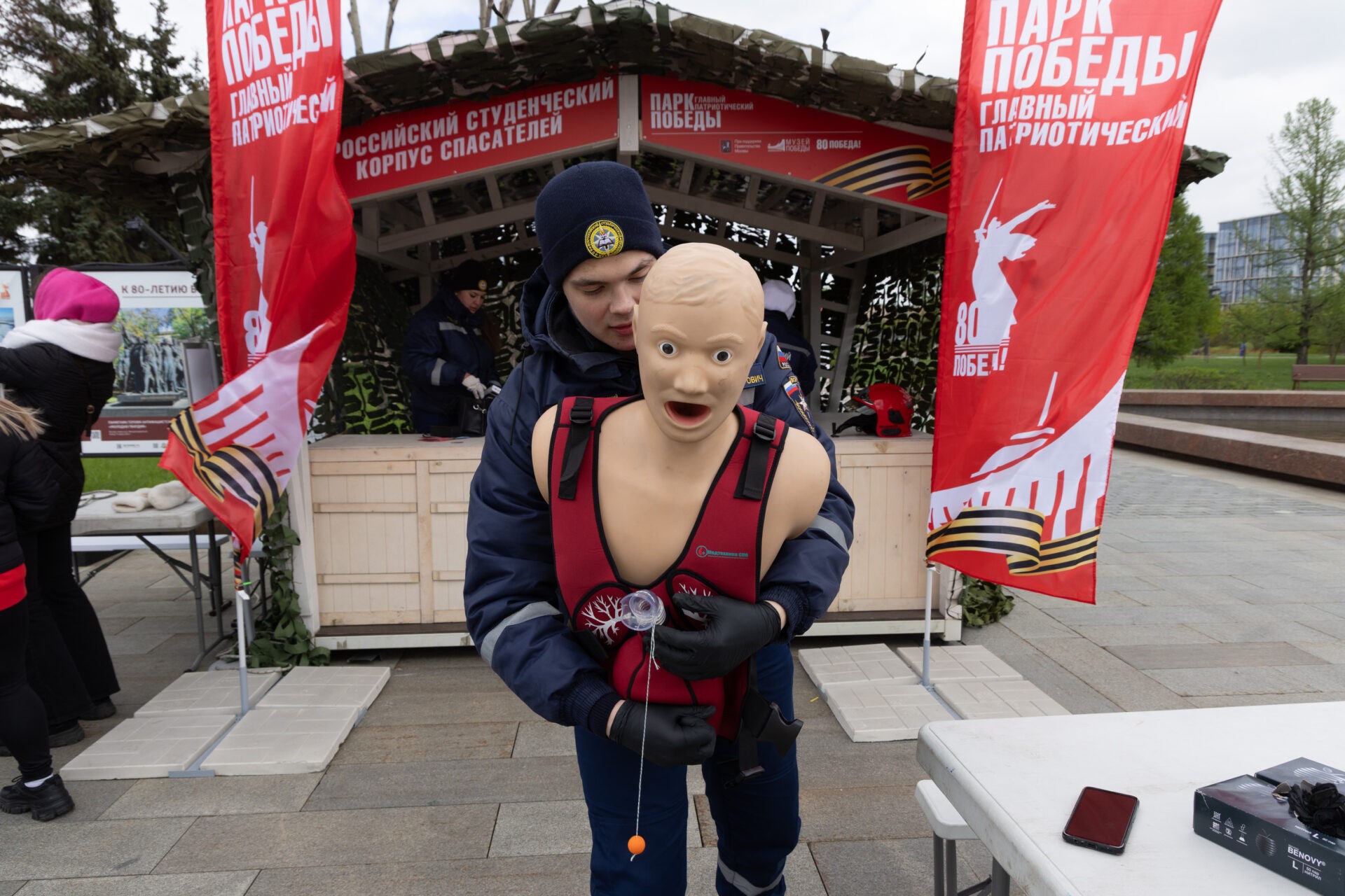 «В Парке Победы у нас представлен «Городок безопасности», на котором есть пять различных локаций: оказание первой помощи, работа с гидравлическим аварийно-спасательным инструментом, надевание боевой одежды пожарного, работа с инструментами по спасению на воде и альпинистскими узлами», — рассказал заместитель руководителя Московского городского отделения Всероссийского студенческого корпуса спасателей Мухридин Назриев.