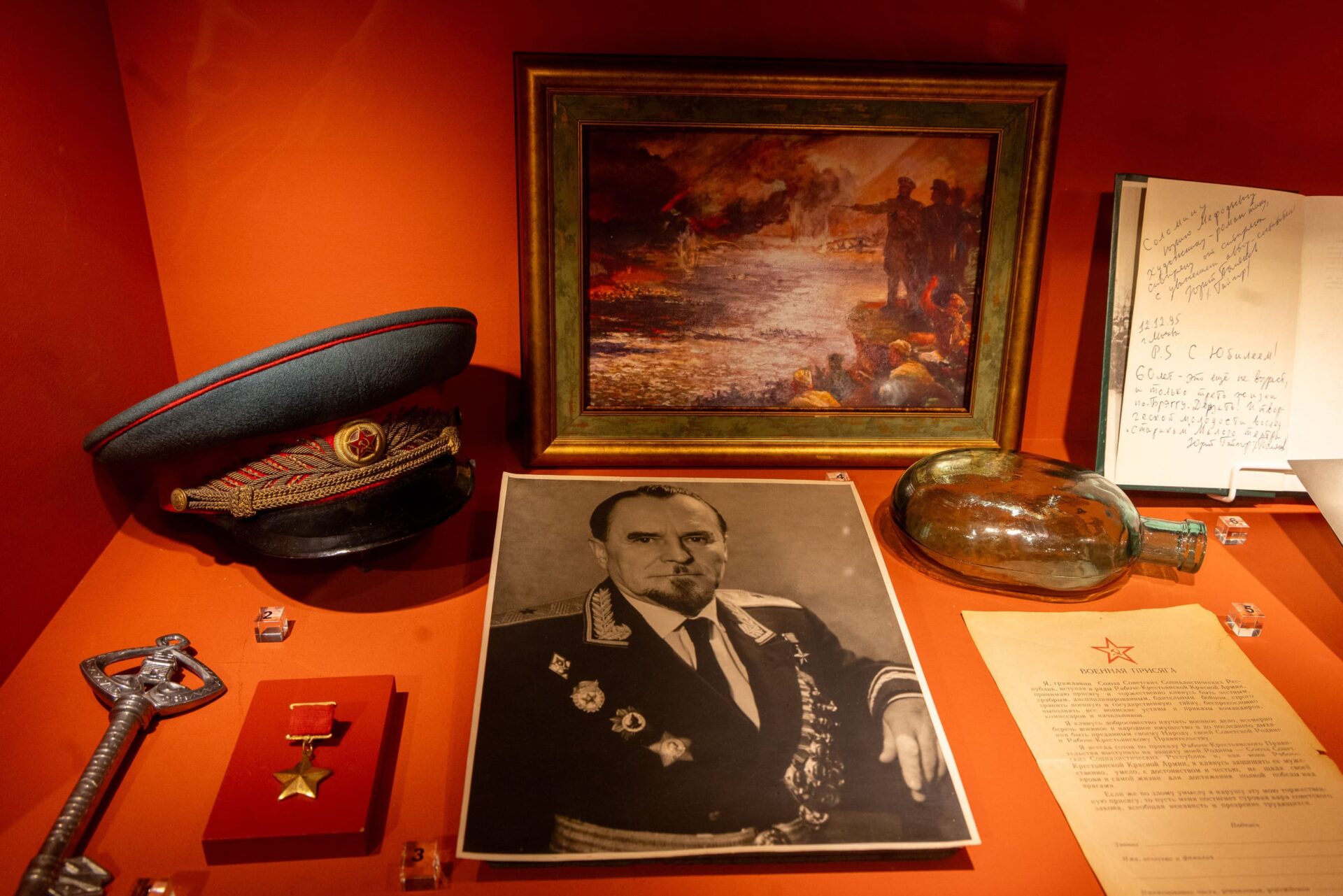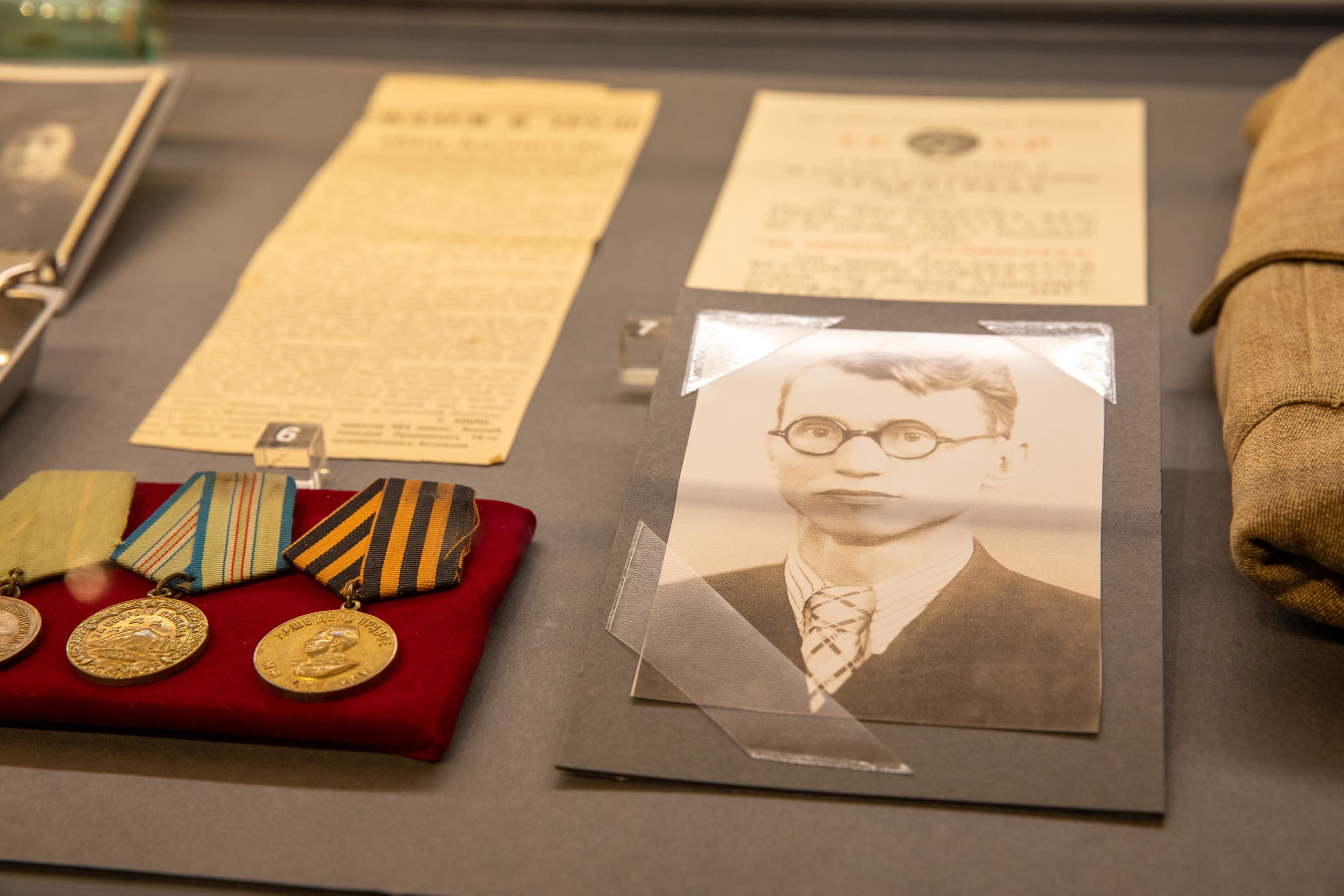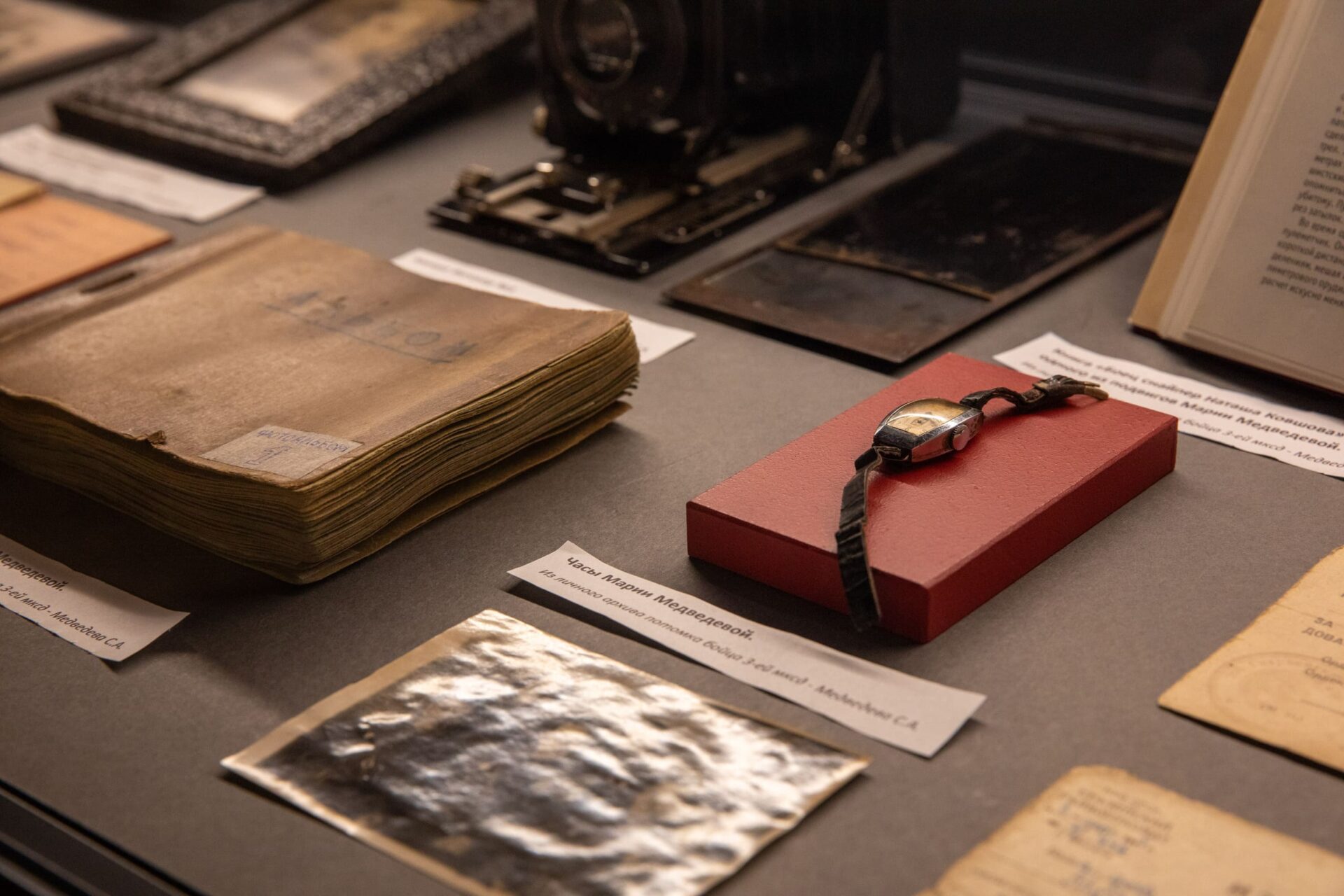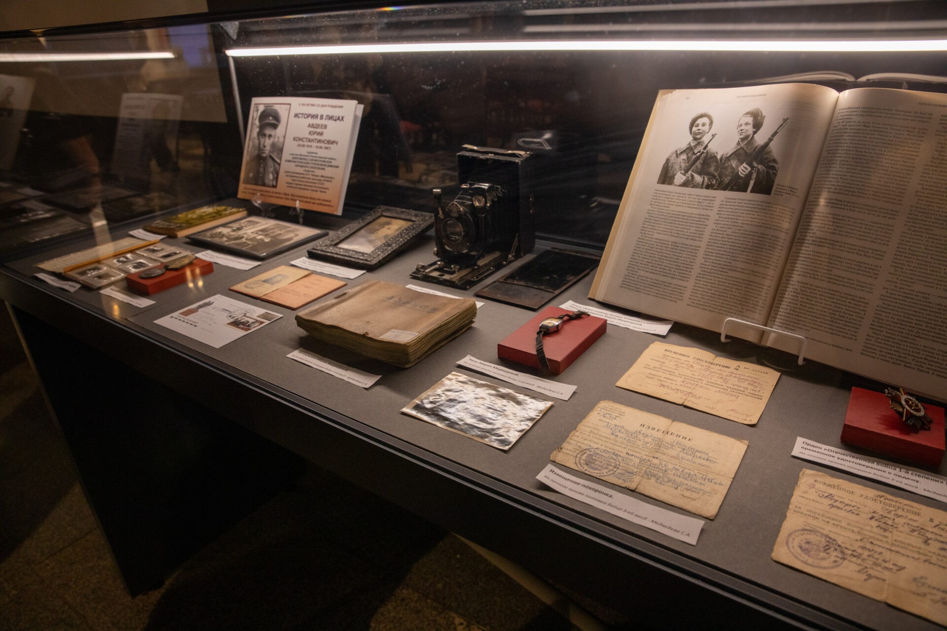 В выставку вошло более 60 предметов из коллекций 13 музеев образовательных учреждений Москвы, Московской и Калининградской областей, Санкт-Петербурга — участников межрегионального проекта «Народное ополчение — от Москвы до Восточной Пруссии». Среди реликвий — военная форма, личные вещи, документы, награды участников Великой Отечественной войны, письма и фотографии из семейных архивов.