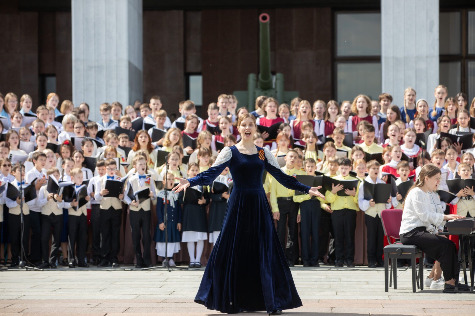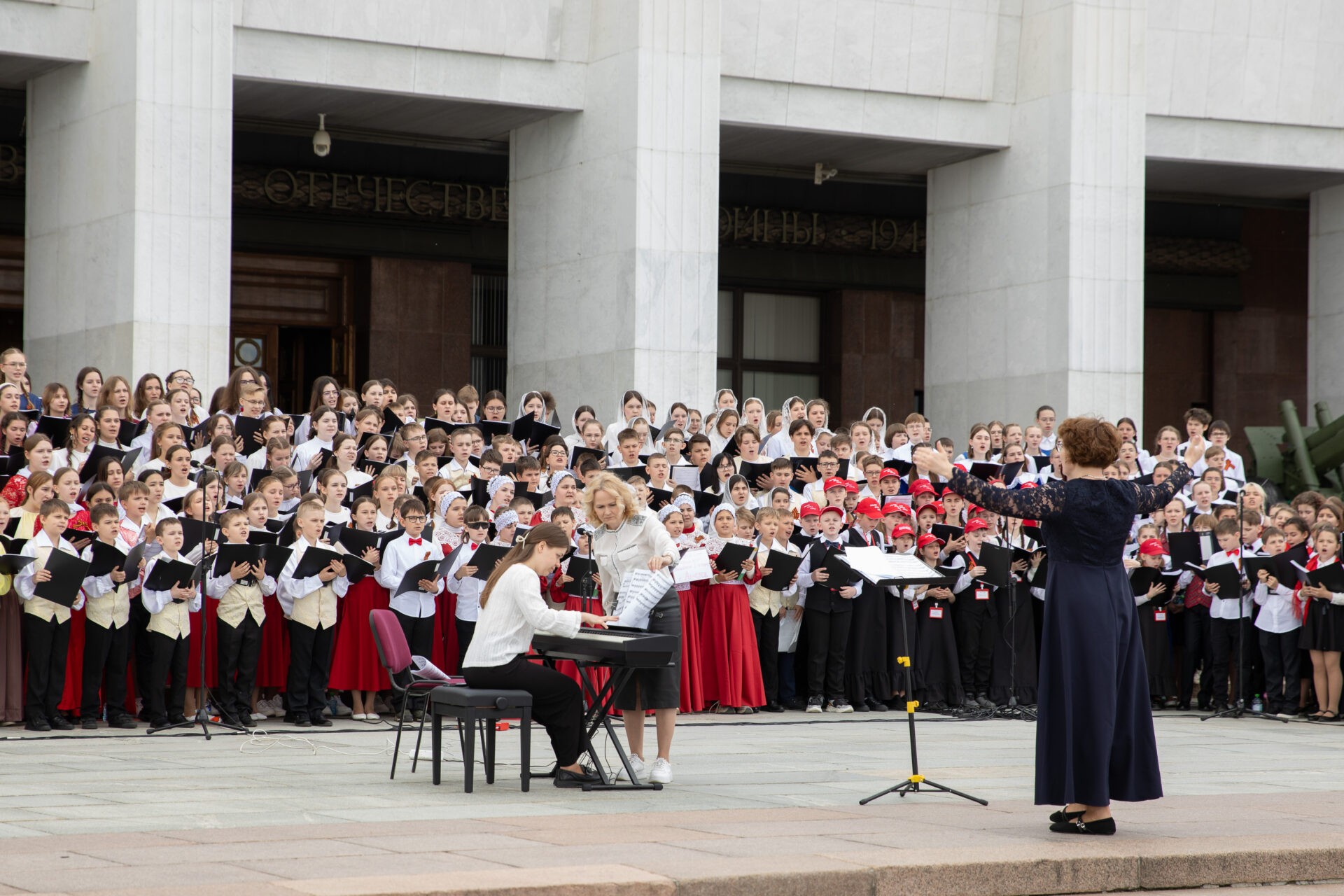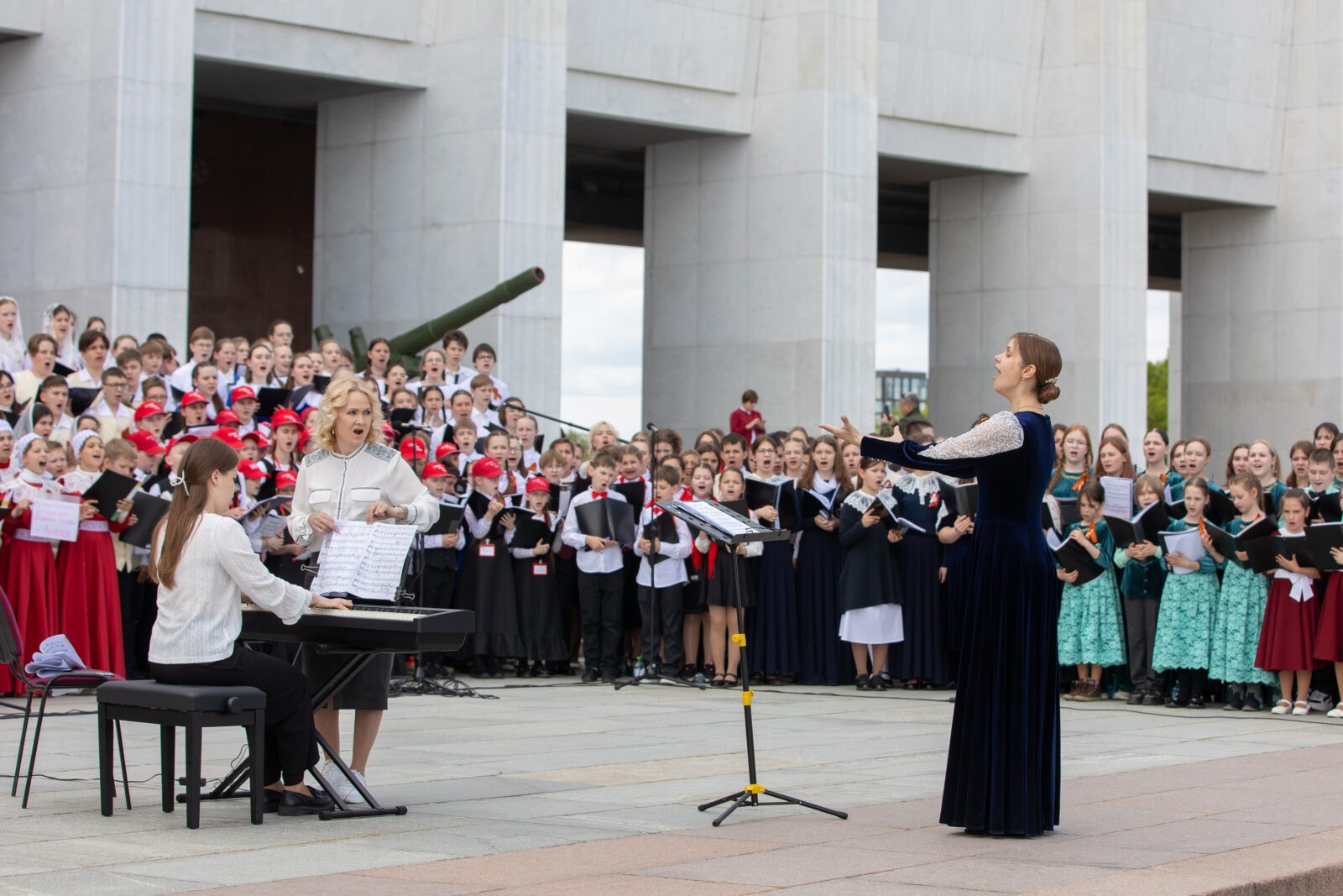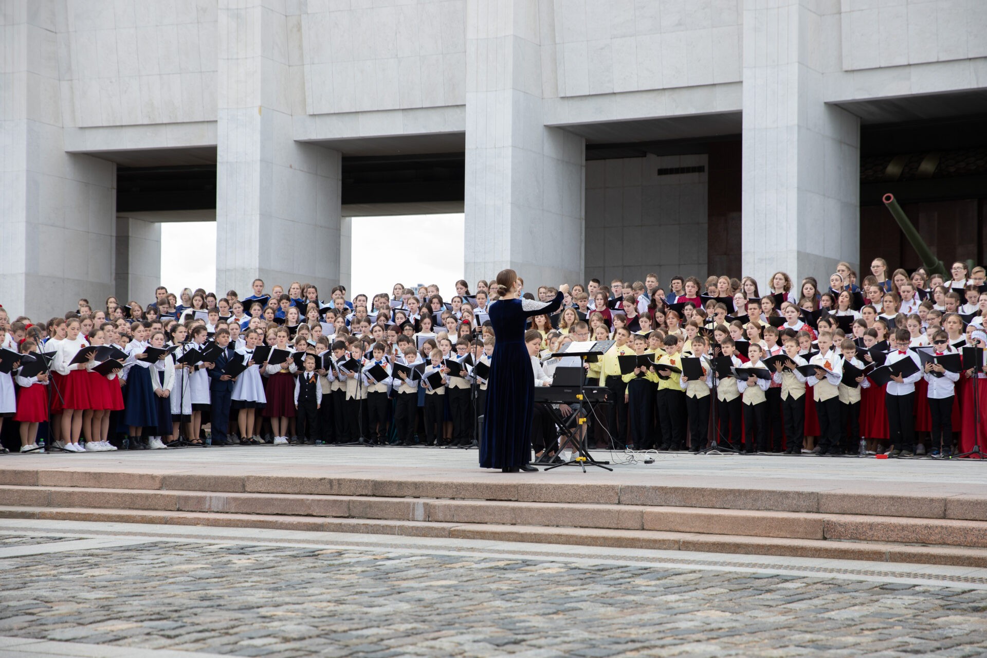 Концерт Всероссийского детского Победного хора прошел возле главного входа в Музей Победы. Свое мастерство показали свыше 700 детей из 30 регионов России и Республики Беларусь.