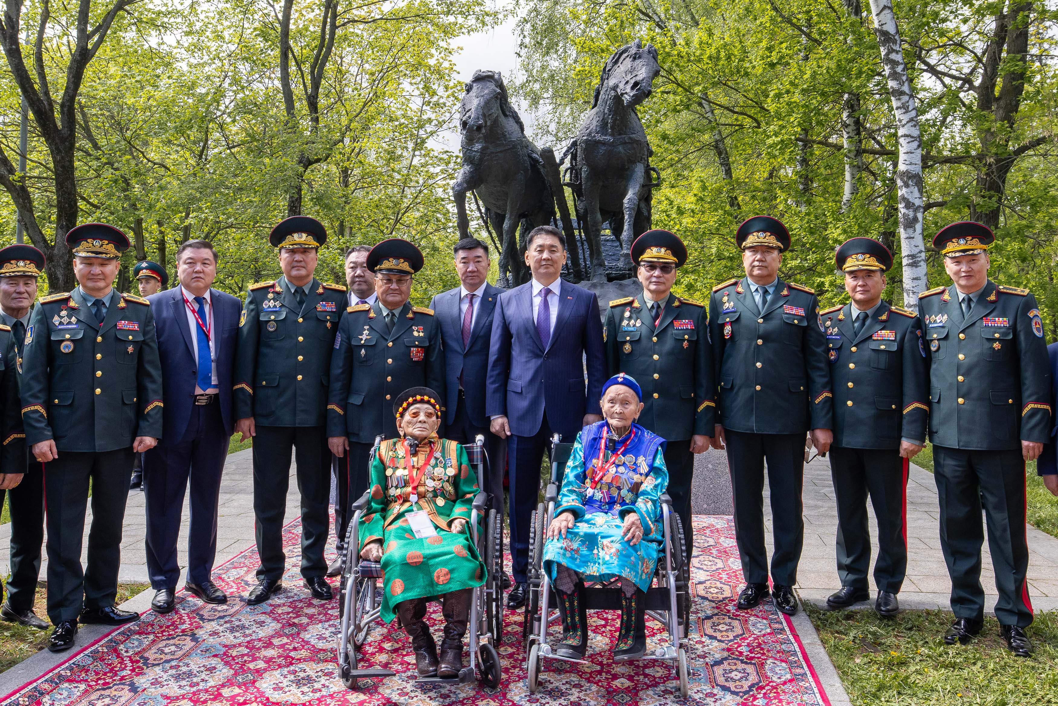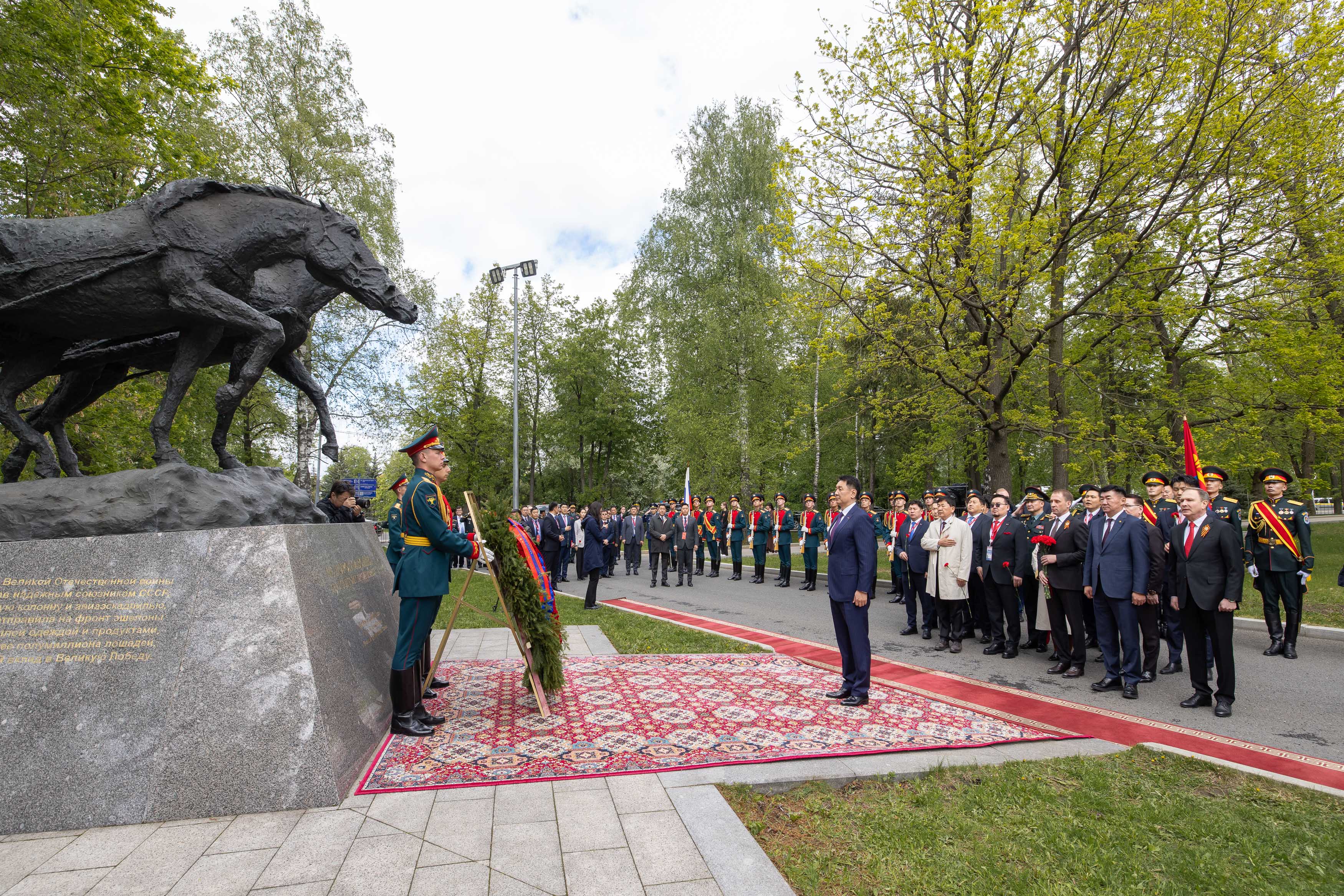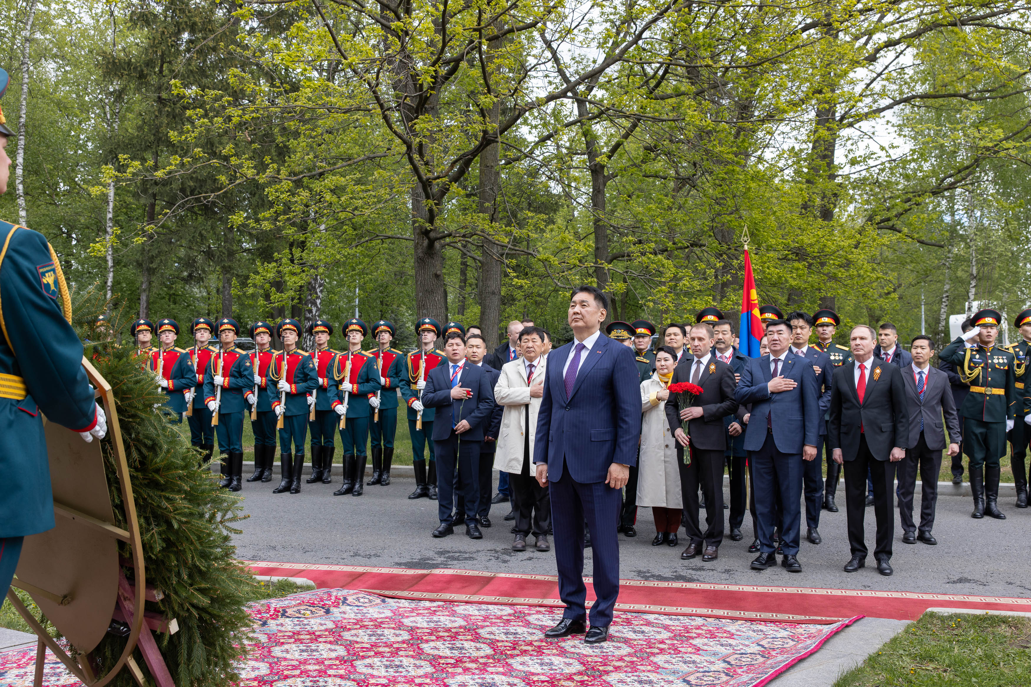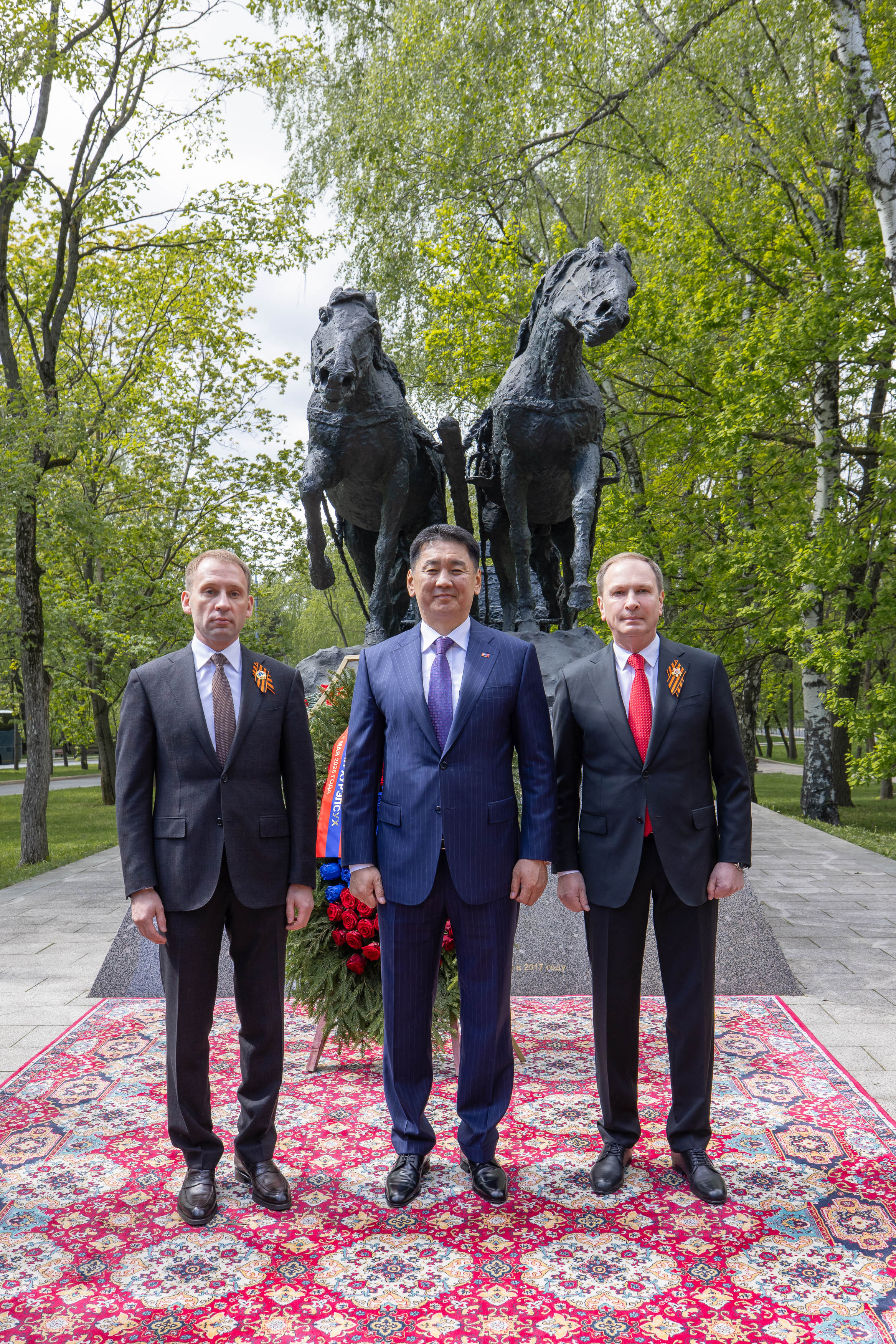 В Москве Президент Монголии принял участие в мемориальной акции у Музея Победы. Ухнаагийн Хурэлсух в составе делегации возложил цветы к памятнику «По дорогам войны».