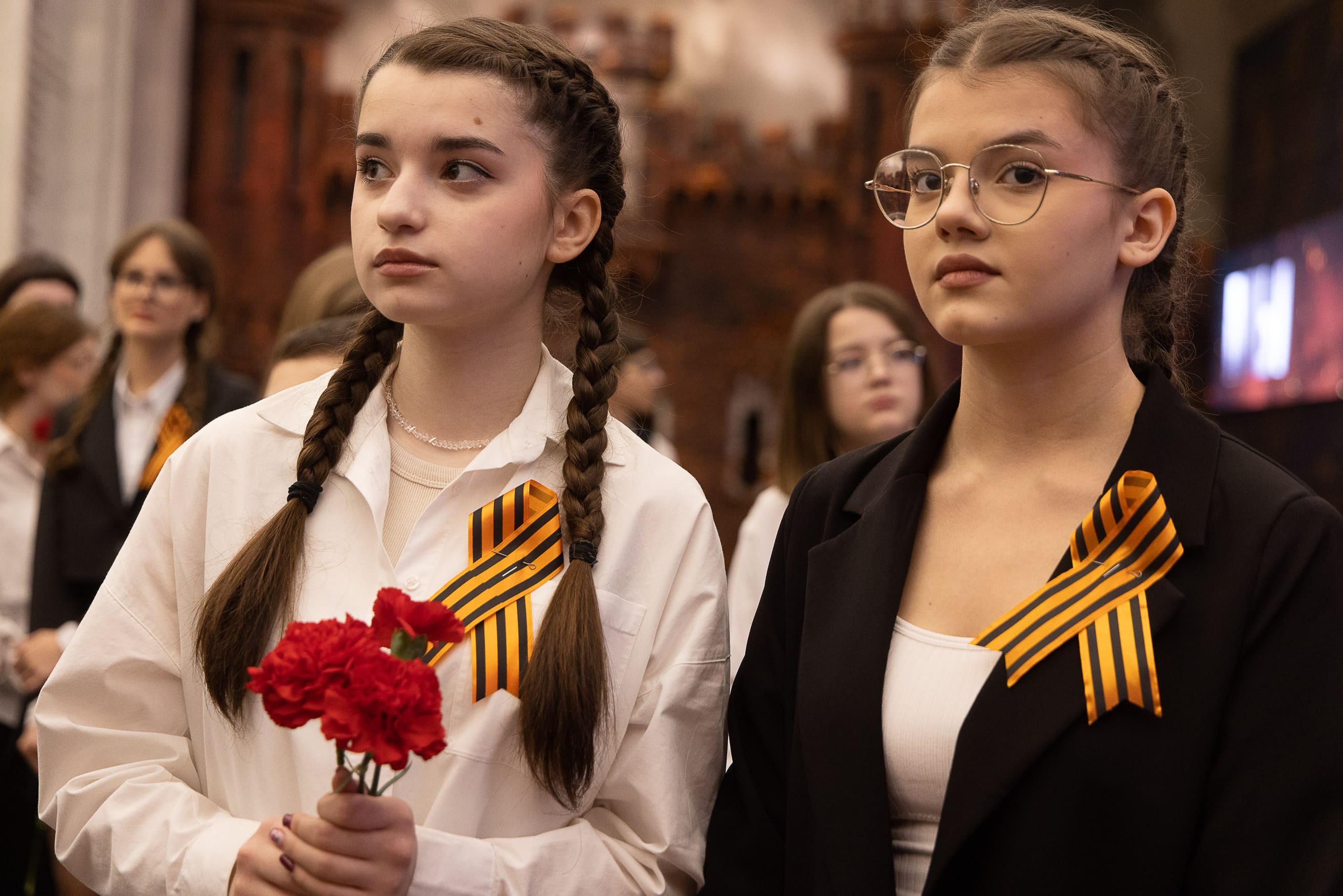 Цветы к скульптуре Солдата-Победителя также возложили около 1,5 тысячи учащихся школ Москвы и Московской области и свыше тысячи студентов из девяти вузов, в том числе ВШЭ, РУДН, РГСУ.