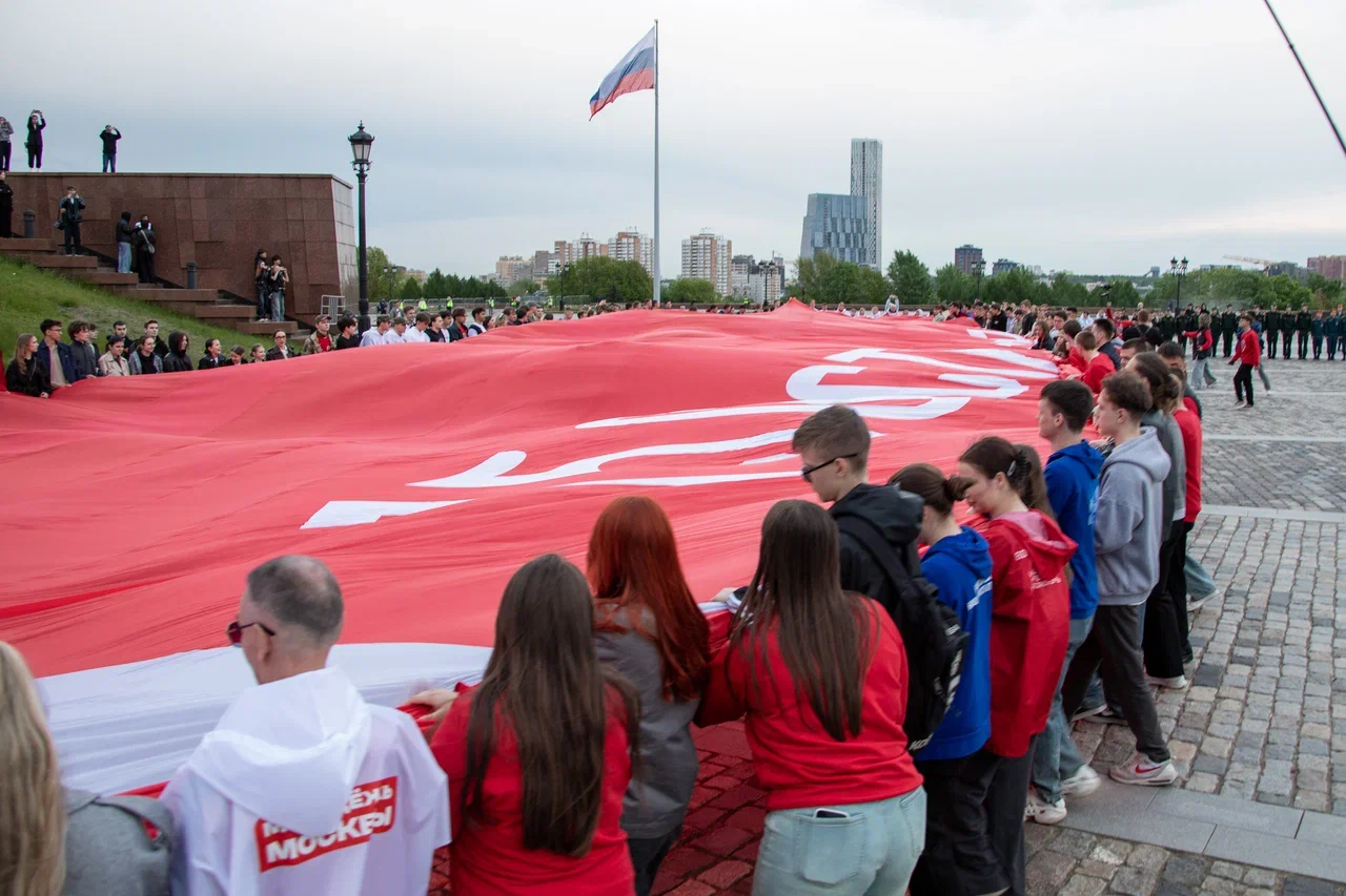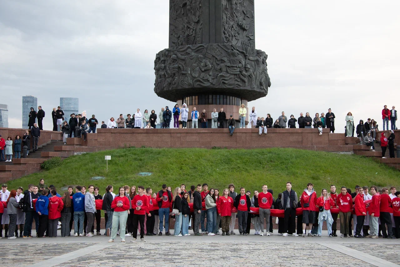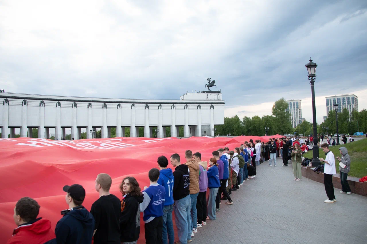 У стен Музея Победы развернули масштабную копию Знамени Победы в честь 80-летней годовщины Победы в Великой Отечественной войне. В акции приняли участие представители молодежных и студенческих организаций России и Республики Беларусь — участники патриотической экспедиции «Непокоренные», а также ветераны Великой Отечественной войны и специальной военной операции, волонтеры и активисты общественных организаций.