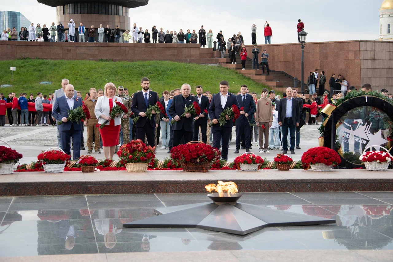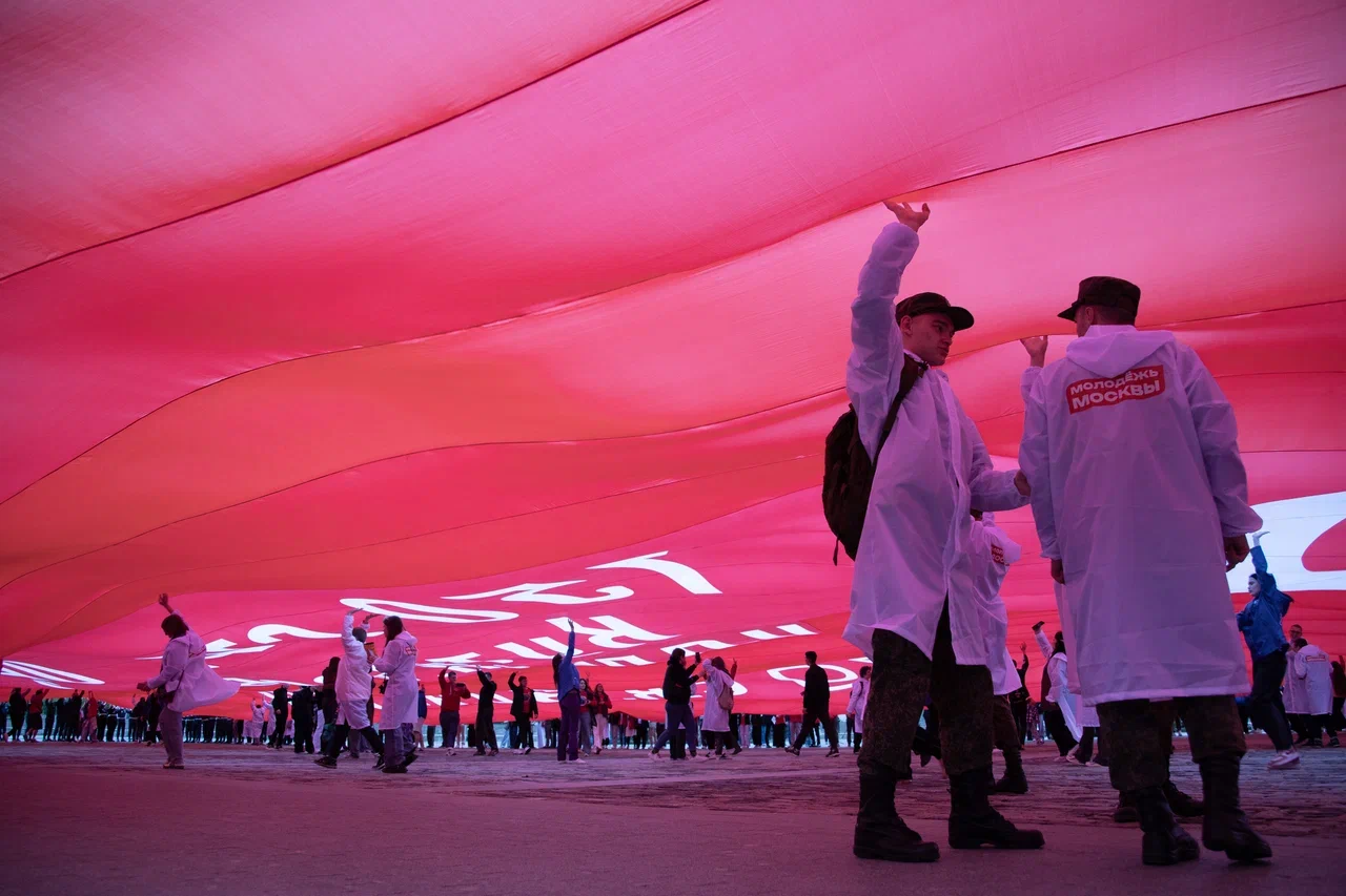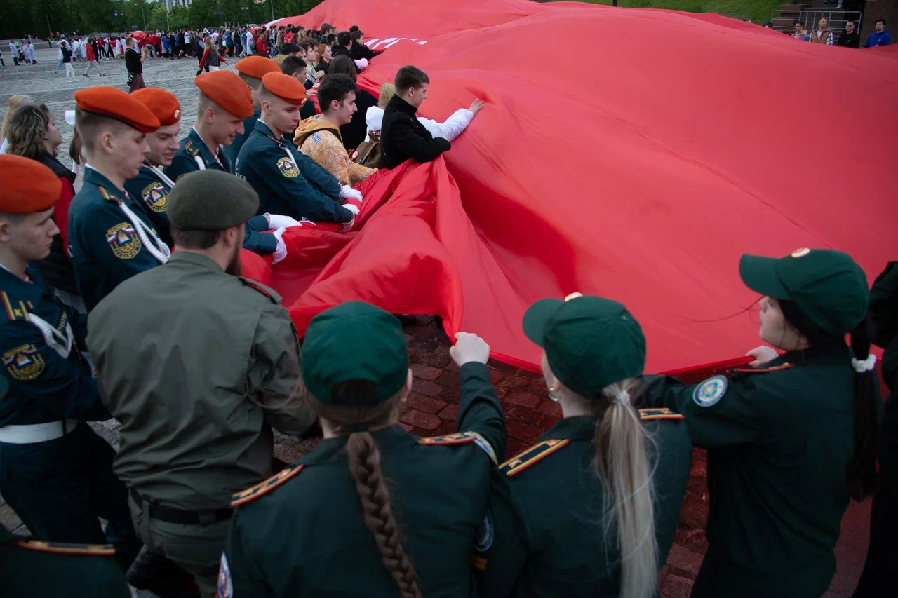 У стен Музея Победы развернули масштабную копию Знамени Победы в честь 80-летней годовщины Победы в Великой Отечественной войне. В акции приняли участие представители молодежных и студенческих организаций России и Республики Беларусь — участники патриотической экспедиции «Непокоренные», а также ветераны Великой Отечественной войны и специальной военной операции, волонтеры и активисты общественных организаций.