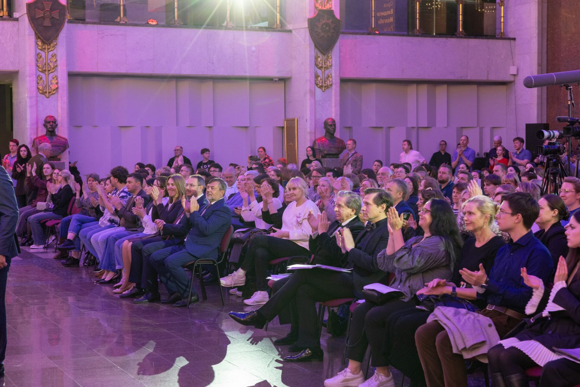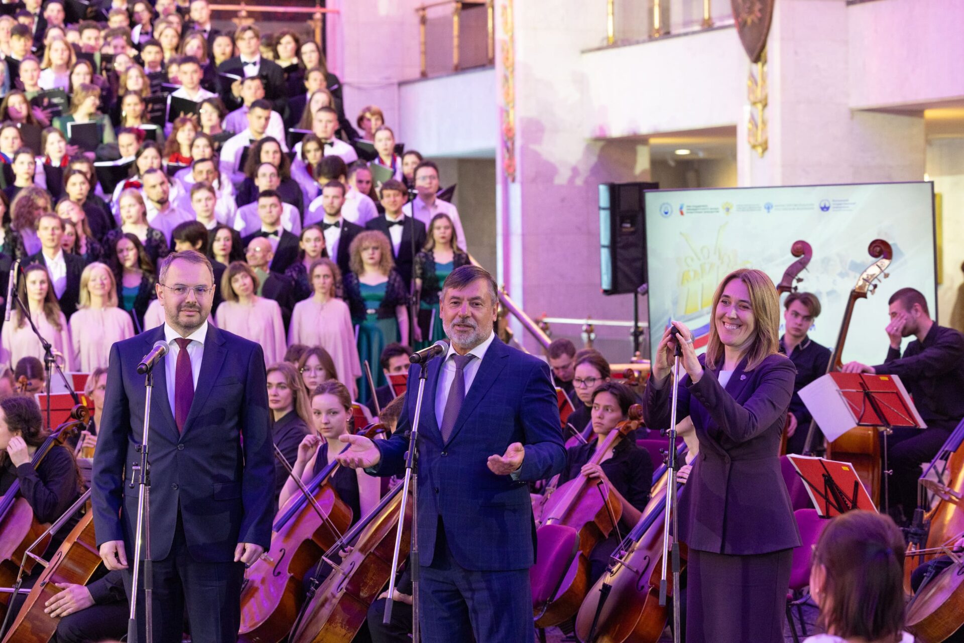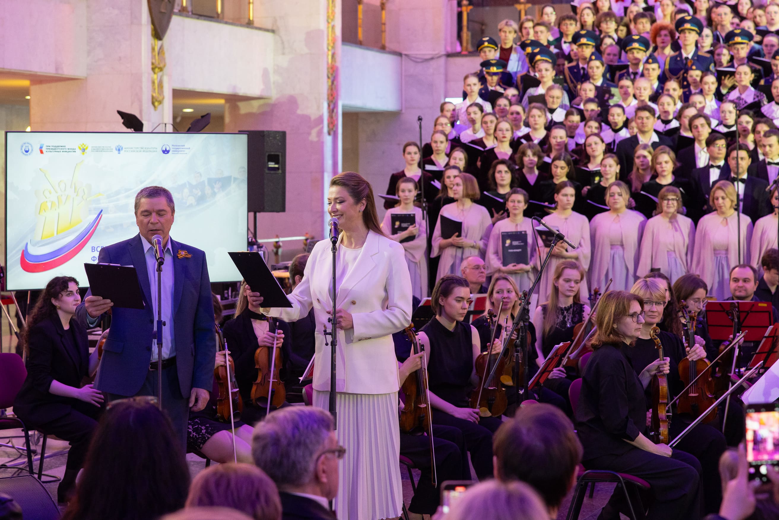 Гала-концерт прошел в величественном Зале Полководцев музея на Поклонной горе. Ведущими стали телеведущая Мария Ситтель и заслуженный артист России Сергей Маховиков. Открыла программу сюита советского композитора Георгия Свиридова «Время, вперед!» в сопровождении симфонического оркестра Московского государственного университета имени Ломоносова.