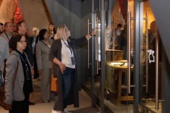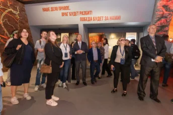 Александр Школьник провел для музейщиков экскурсию по экспозиции «Путь к Победе». Экспозиция размещена на площади почти 4,5 тысячи квадратных метров и посвящена воинской доблести Красной Армии. Это настоящая фронтовая летопись войны в лицах и военных судьбах красноармейцев. Уникальность проекта состоит в том, что наряду с подвигами военачальников показаны и судьбы простых бойцов, раскрыта природа массового героизма.