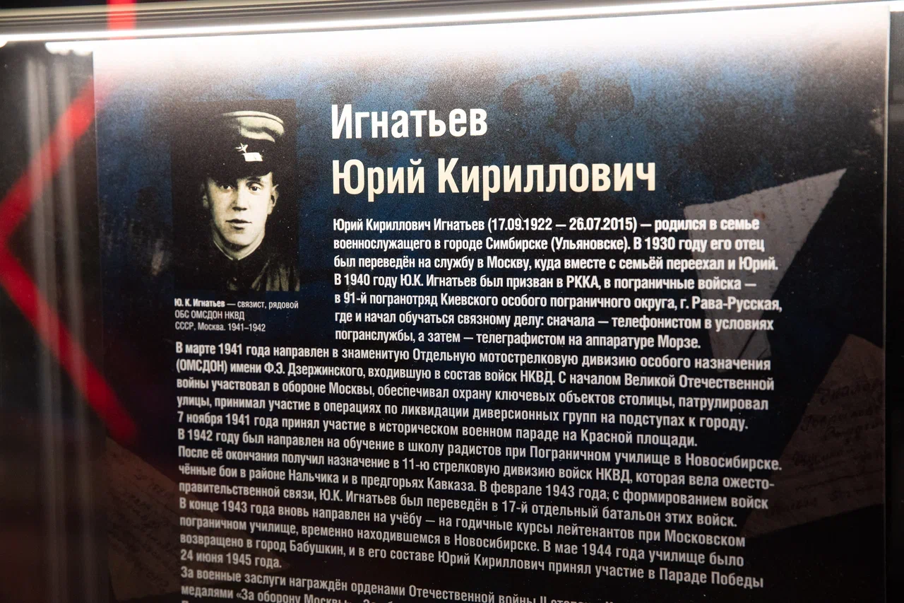 На выставке посетители Музея Победы увидят предметы, переданные самим Юрием Кирилловичем Игнатьевым в дар Музею Победы. Среди экспонатов — красноармейская книжка курсанта 1-го батальона 2-й роты МВТУ НКВД имени Менжинского, грамота курсанту Ю. К. Игнатьеву — участнику Парада Победы — от начальника Московского военного училища НКВД (1945), а также архивные фотографии. Временную экспозицию дополнят радиостанция А-7-А, сигнальный карманный трехцветный фонарь, а также рисунки фронтового художника Михаила Ефимовича Коноплина 1944 года.