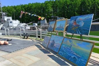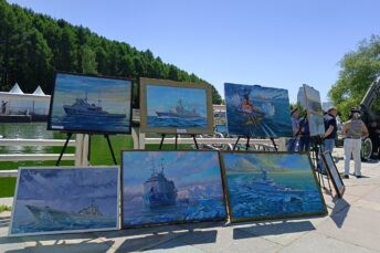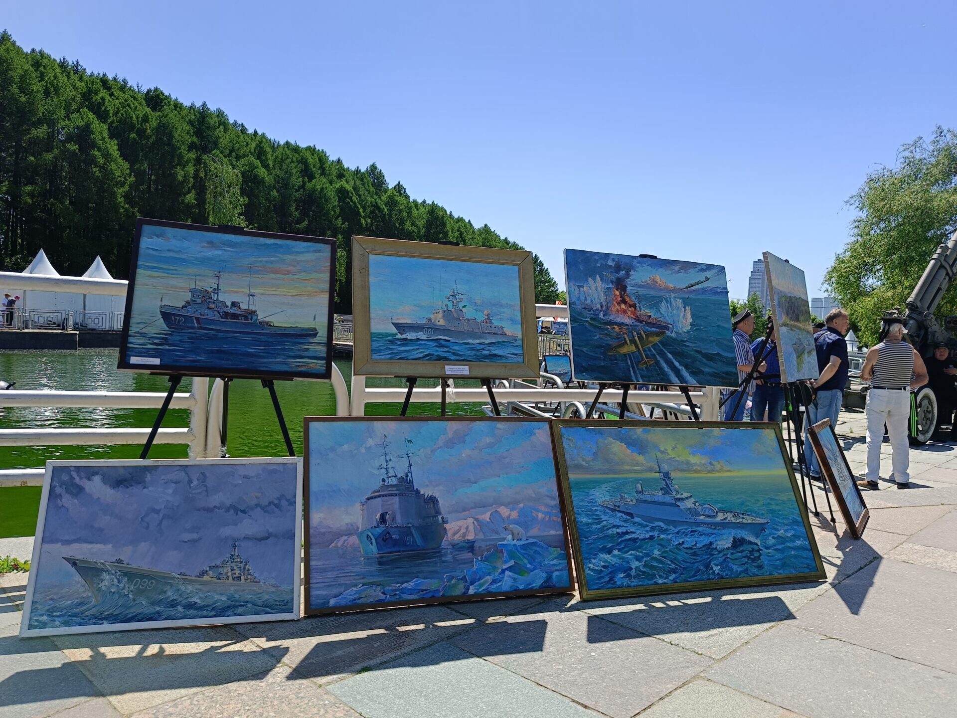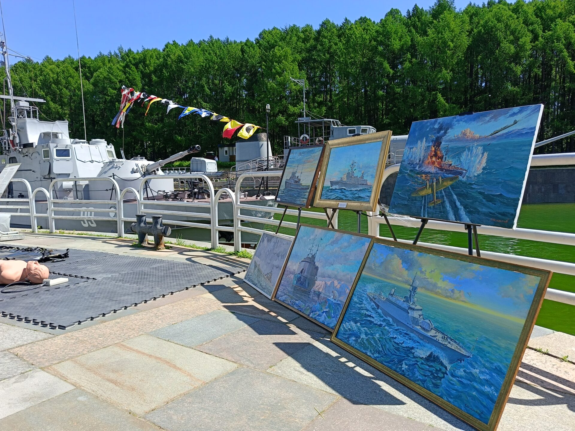 В морской локации также организовали выставку работ художника из Татарстана Ильгиза Исхакова. Все картины посвящены ВМС РФ.