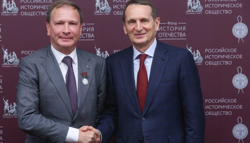 Председатель Российского исторического общества (РИО) Сергей Нарышкин вручил Большую серебряную медаль РИО генеральному директору Музея Победы, заместителю секретаря Общественной палаты РФ, члену Совета РИО Александру Школьнику.