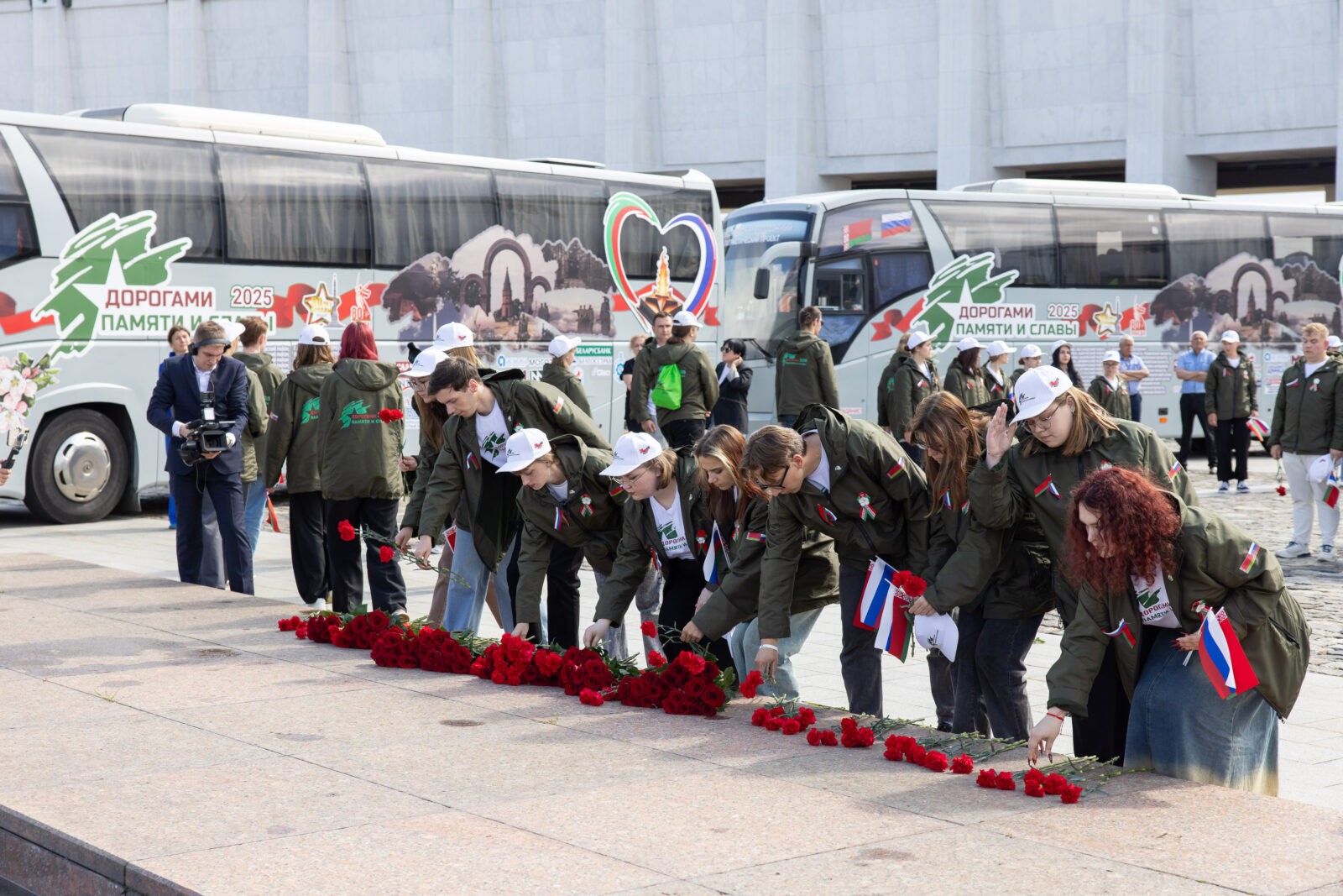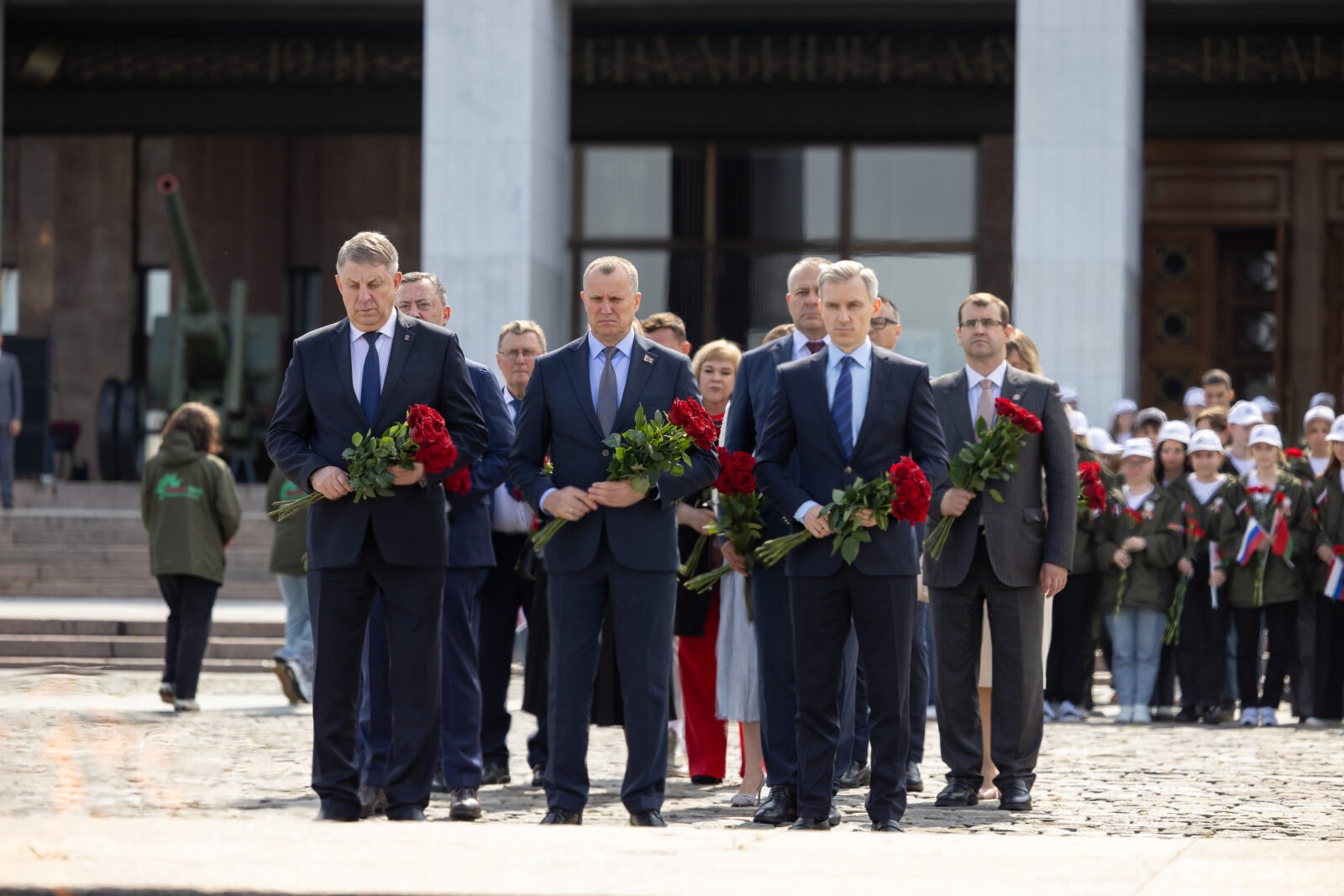 Участники историко-патриотического форума «Дорогами Памяти и Славы — 80 лет Победы» возложили цветы и почтили минутой молчания память защитников Отечества, павших в 1941–1945 годах, возле Огня Памяти и Славы у стен Музея Победы.