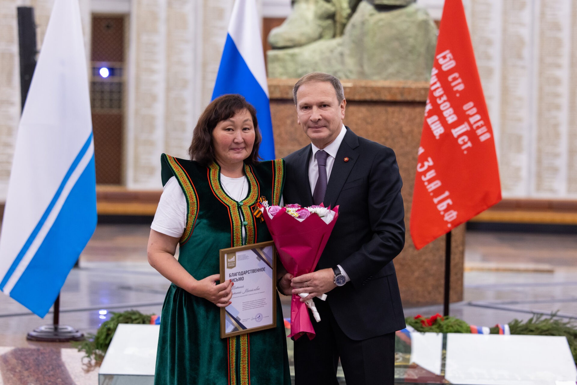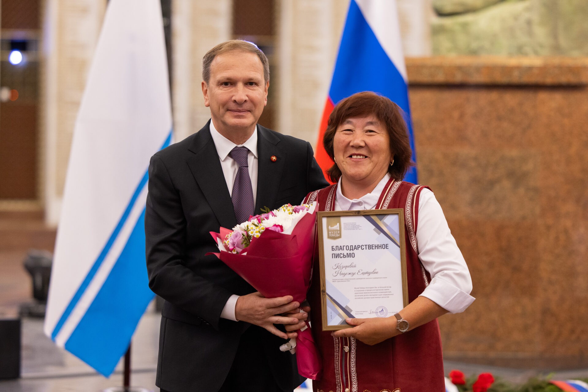 Во время официальной церемонии Дня Алтая в Музее Победы генеральный директор Музея Победы Александр Школьник вручил благодарственные письма сотрудникам школьных музеев Республики Алтай.