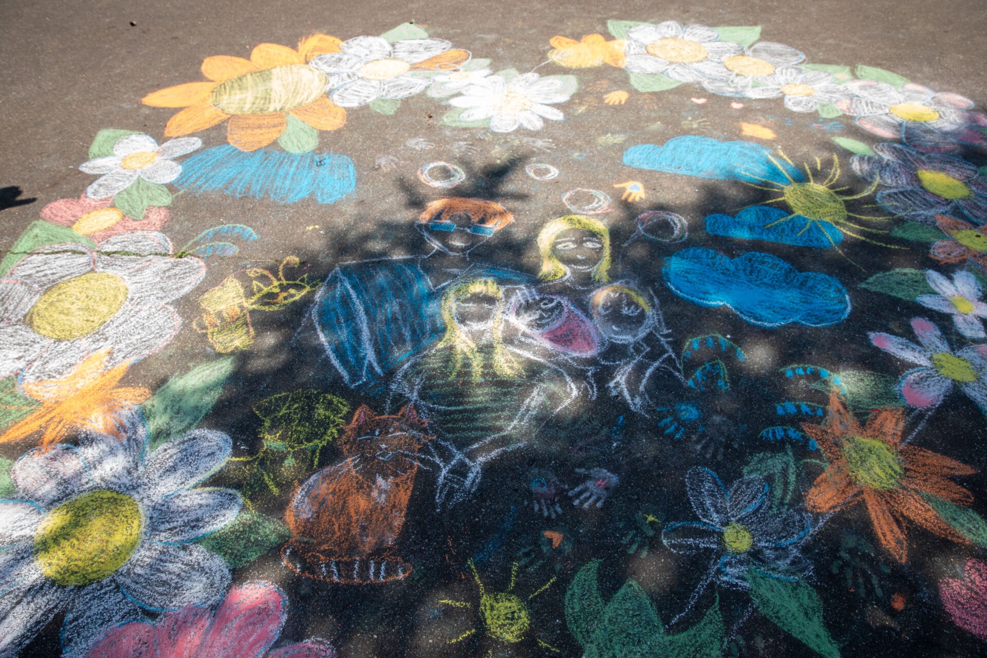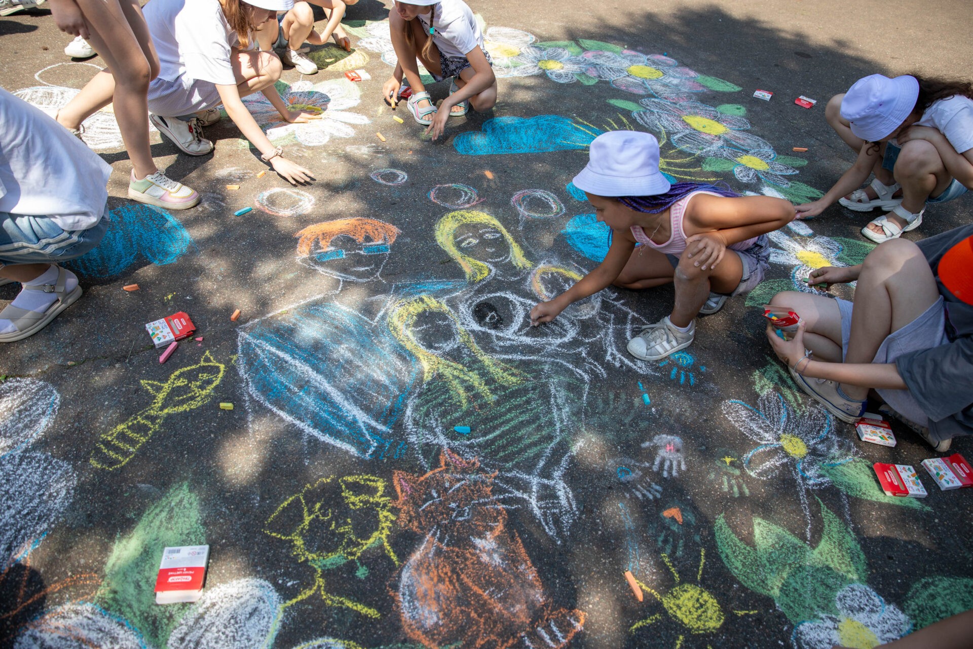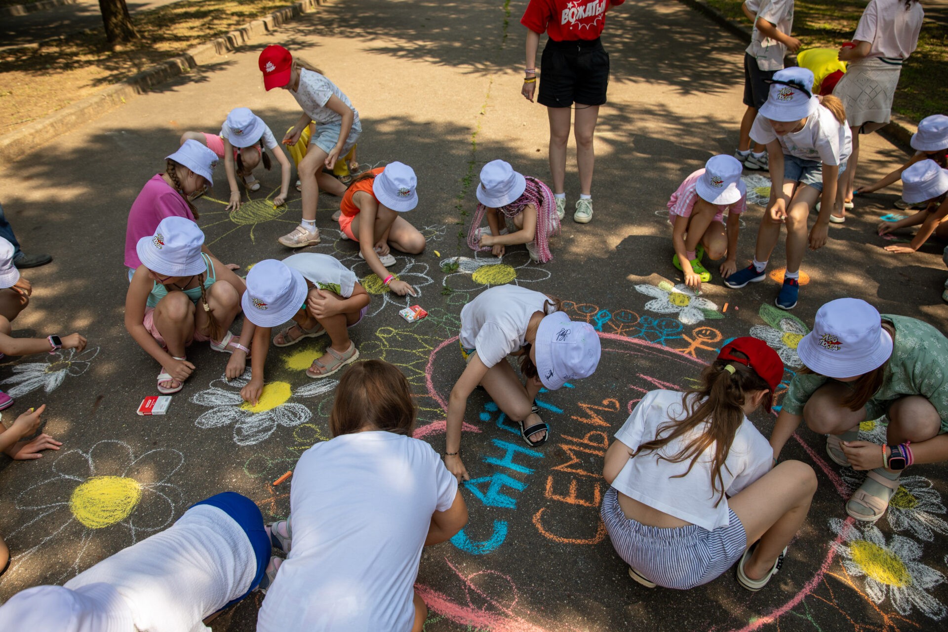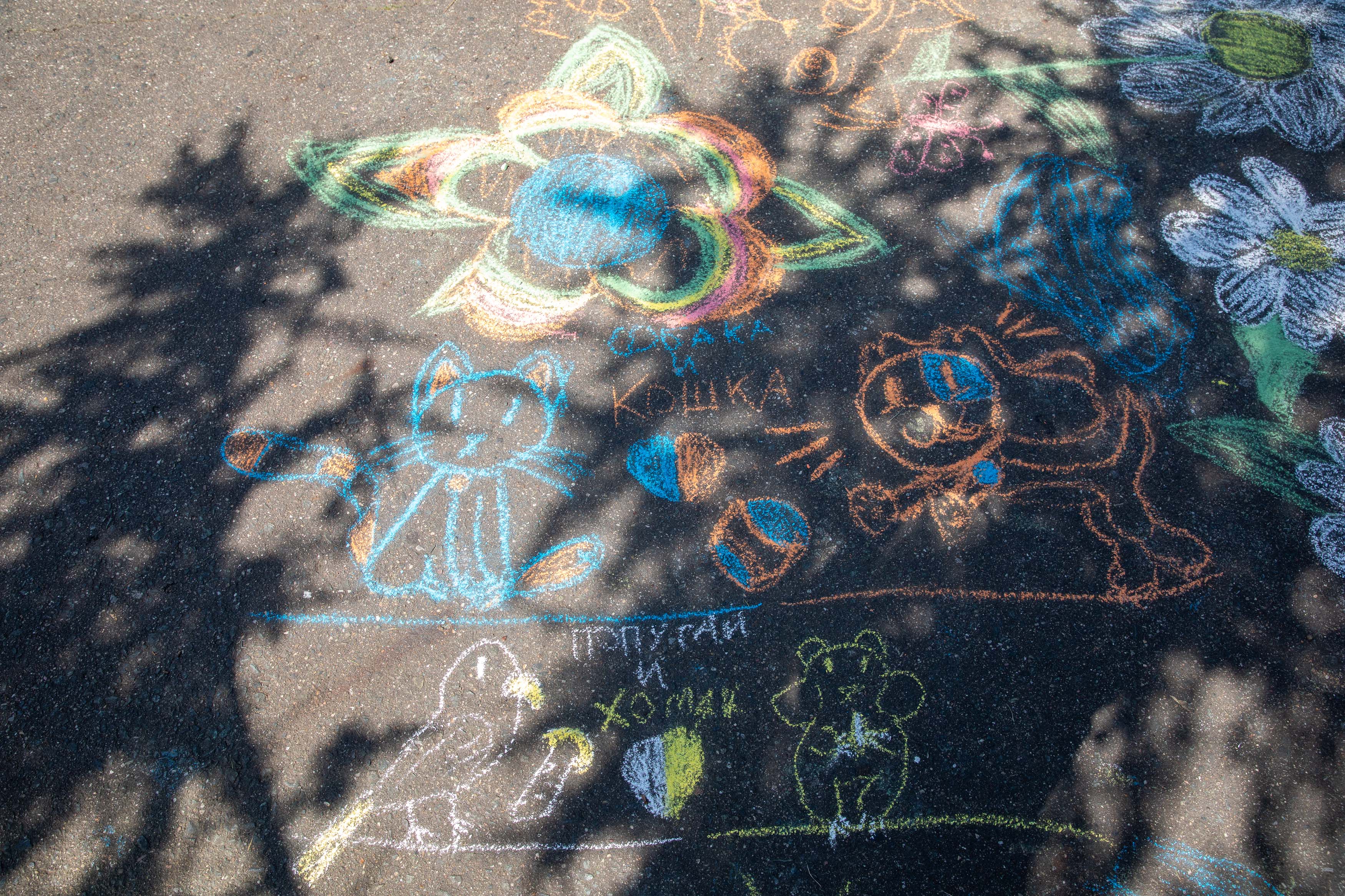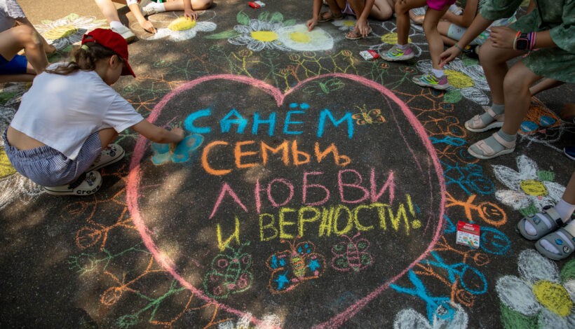 Школьники украсили рисунками на асфальте территорию музея под открытым небом. Дети нарисовали символ Дня семьи, любви и верности – ромашку, а также посвятили изображения семье и близким, дому.