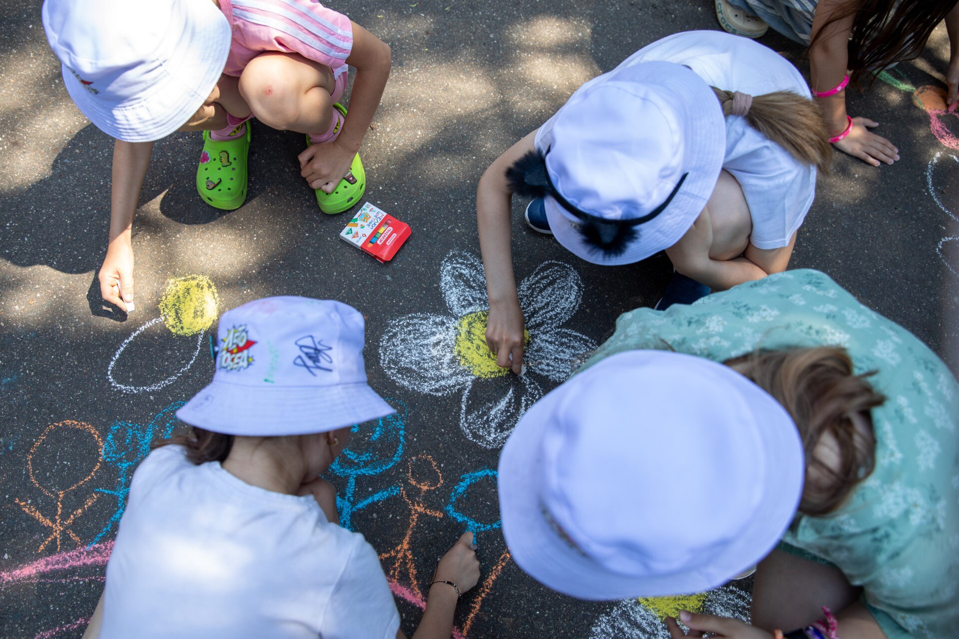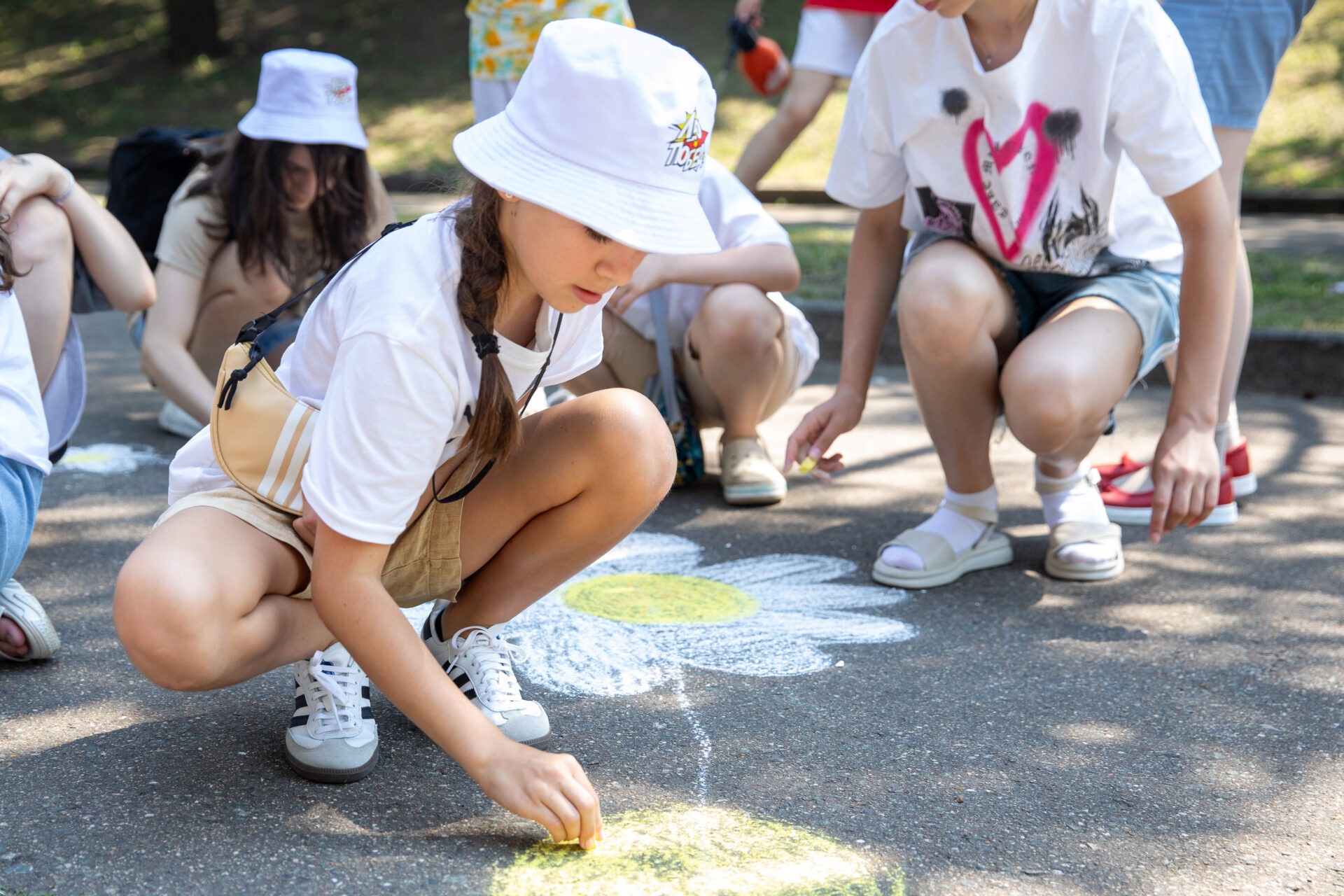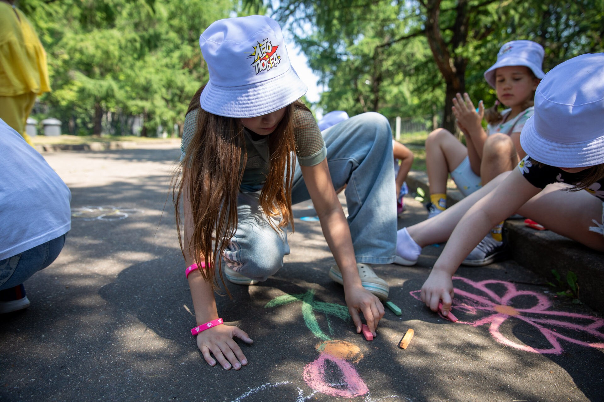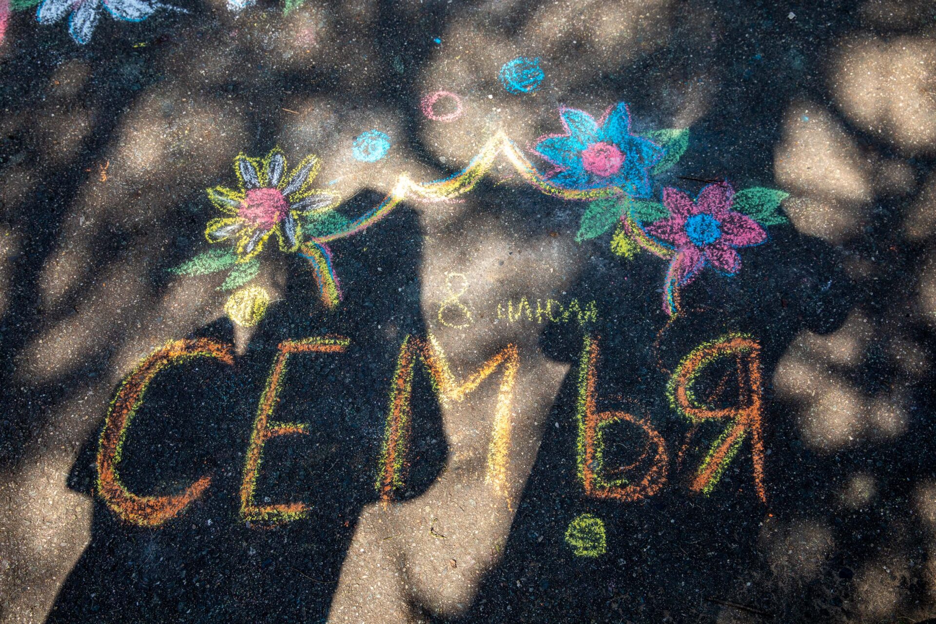 Школьники украсили рисунками на асфальте территорию музея под открытым небом. Дети нарисовали символ Дня семьи, любви и верности – ромашку, а также посвятили изображения семье и близким, дому.
