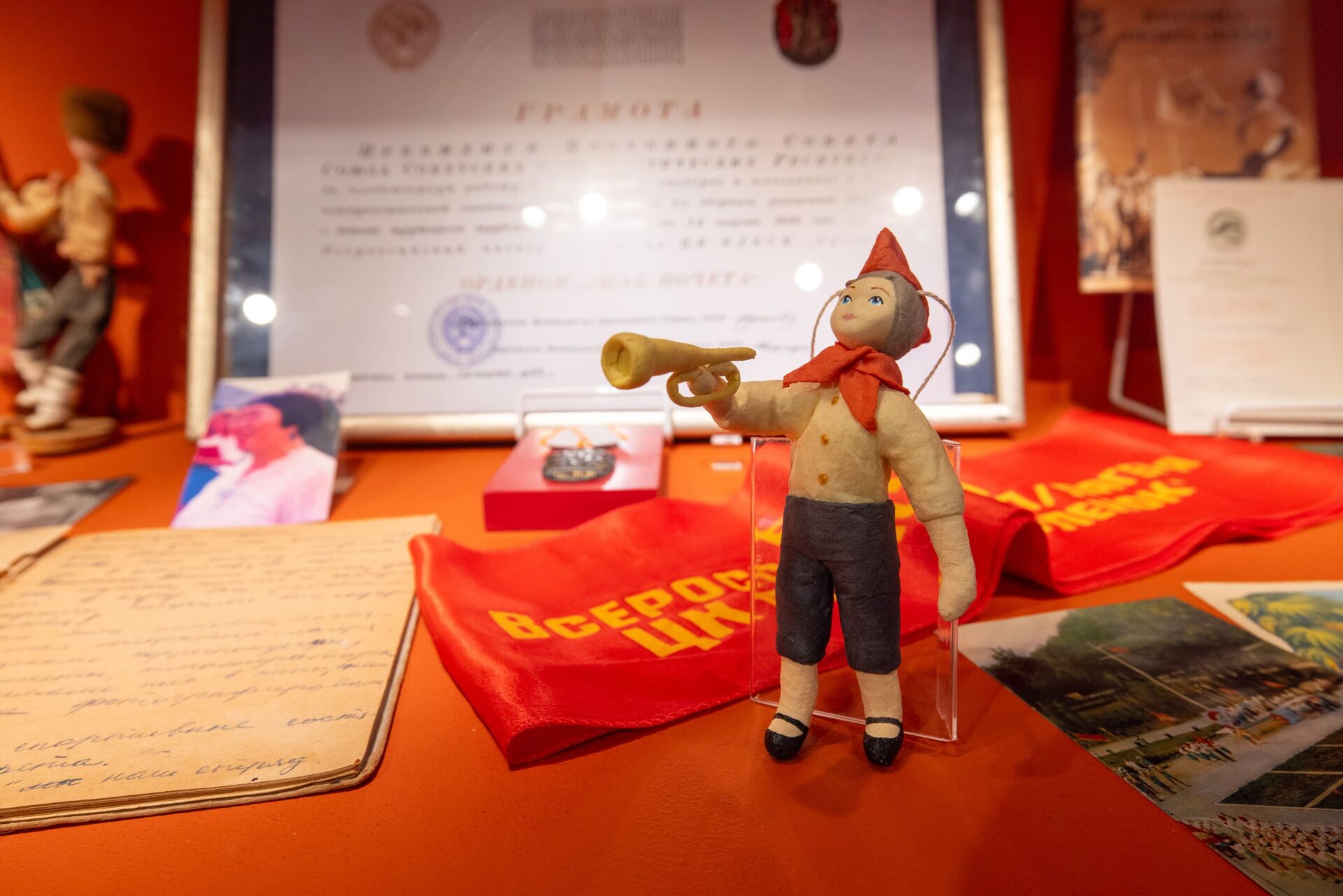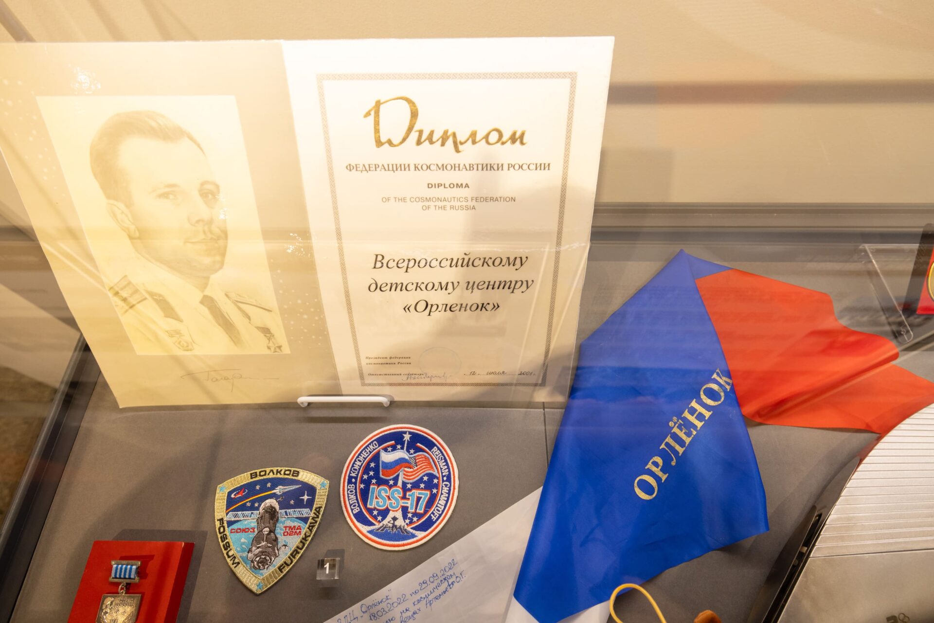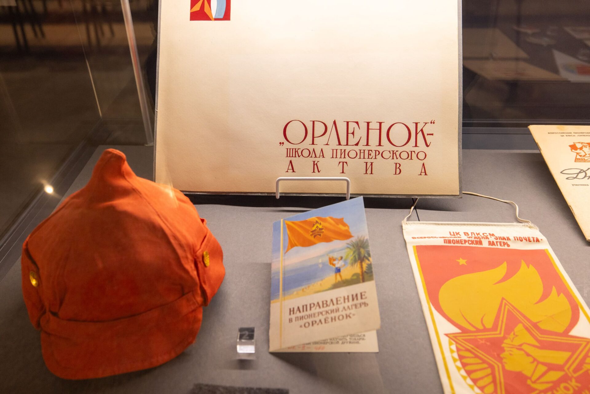 Среди уникальных предметов выставки – первое красное бархатное знамя «Орленка» и галстук, который в 2022 году побывал на МКС. В витринах также представлены многочисленные фотографии, печатные издания, фигурки пионеров, записи и дневники вожатых, рабочие тетради дежурных по лагерю и другие документы. Кроме того, на выставке в Музее Победы можно увидеть подарки «Орленку». Например, гитару барда, поэта, киноактера Юрия Визбора и книгу «Земная и космическая живопись» с автографом Алексея Леонова – первого человека в мире, вышедшего в открытый космос.