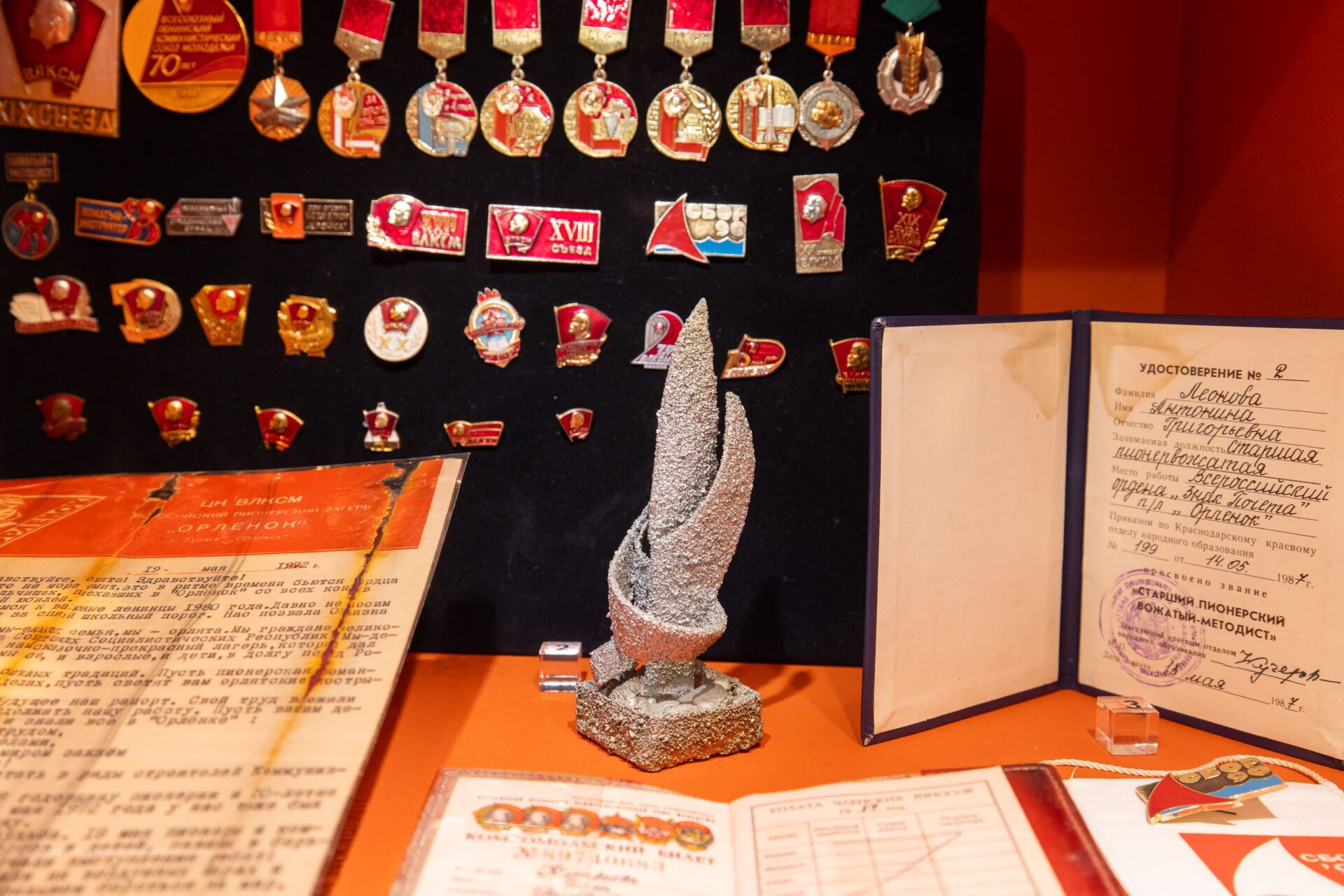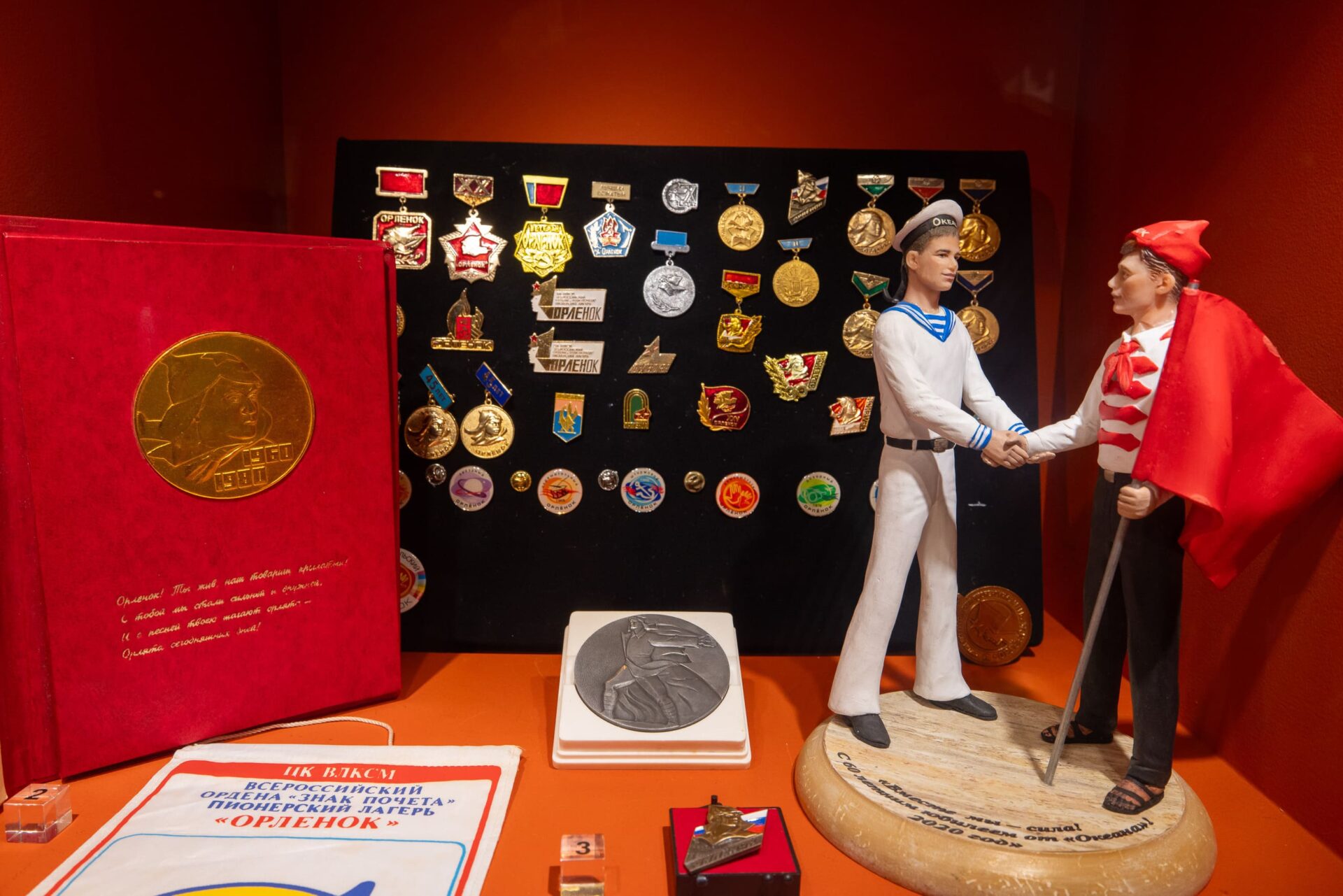 В музее на Поклонной горе воссоздали атмосферу легендарной «республики детства». Выставка знакомит с ежедневной жизнью «орлят» — гости увидят форму детей и вожатых разных лет, коллекцию значков и медалей, удостоверения и грамоты, открытки и плакаты. И конечно, символы пионерии — алый галстук, горн и барабан. Экспозиция расскажет, как ребята проводили время и чем занимались, как был обустроен быт детей. Посетители также узнают о самых известных гостях и участниках смен в «Орленке».