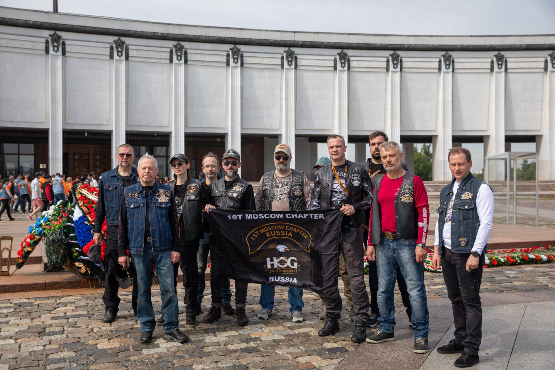 Делегация международного мотопробега в честь 80-летия Великой Победы в войне 1941-1945 годов сделала остановку возле Музея Победы в Москве. Путешествие по городам-героям и городам воинской славы организовало сообщество мотоциклистов «Harley Owners Group Russia & CIS» при участии мотоклуба «Железные птицы».