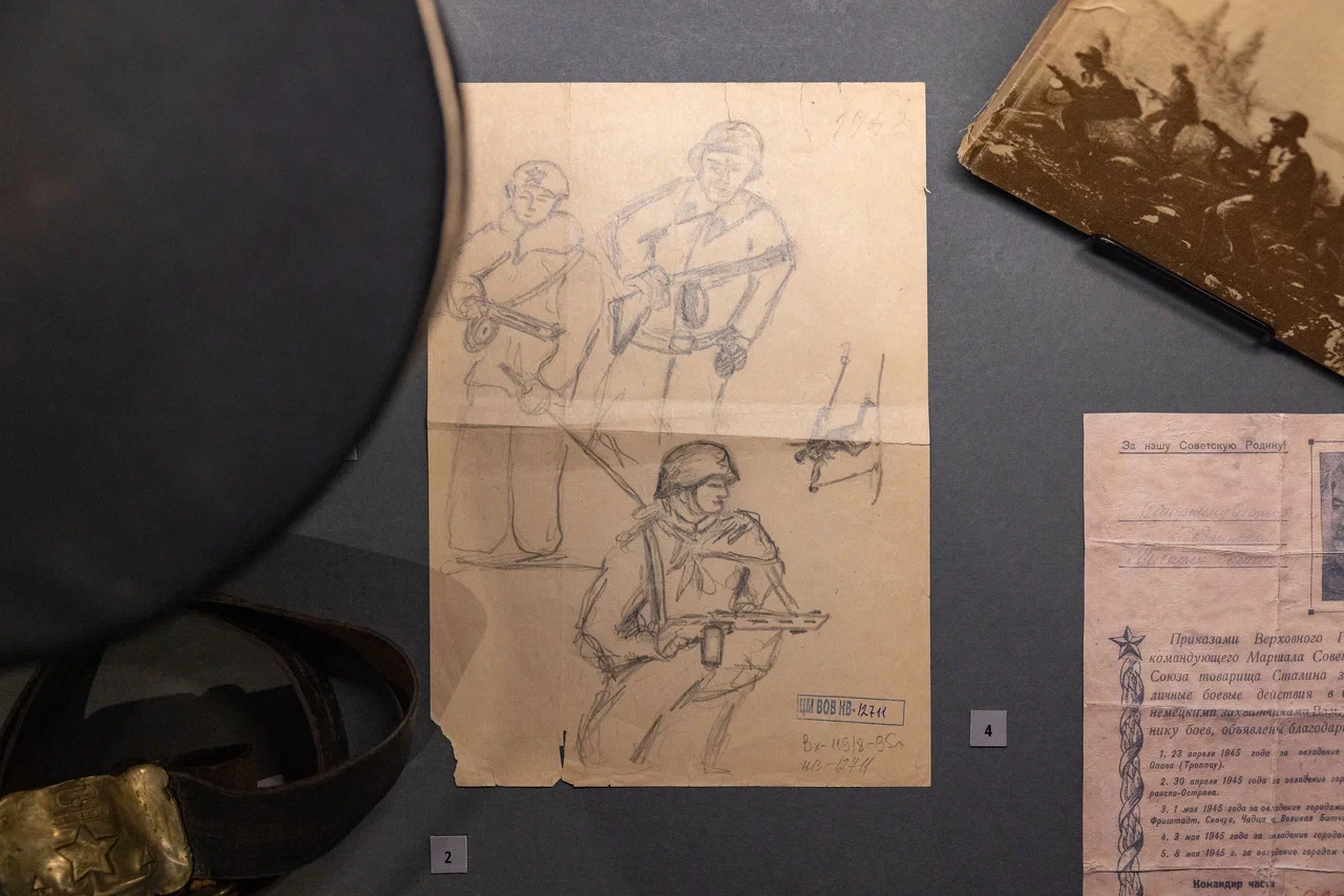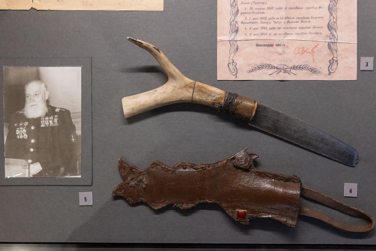 «В витринах представили личные вещи Михаила Васильевича, которые он передал в дар музею. Среди уникальных раритетов — трофейный самодельный нож, которым финский боец в 1939 году нанес удар в спину Подгурскому. Нож пробил котелок и застрял в сухарях в вещмешке, а Подгурский сумел вывернуться, сбросить финна и одержать победу. Экспозицию дополняют архивные фотографии и документы, в том числе грамота от командира воинской части за отличные действия в боях с немецкими захватчиками по овладению городами в ходе Моравско-Островской и Пражской наступательных операций», - рассказали в пресс-службе Музея Победы.