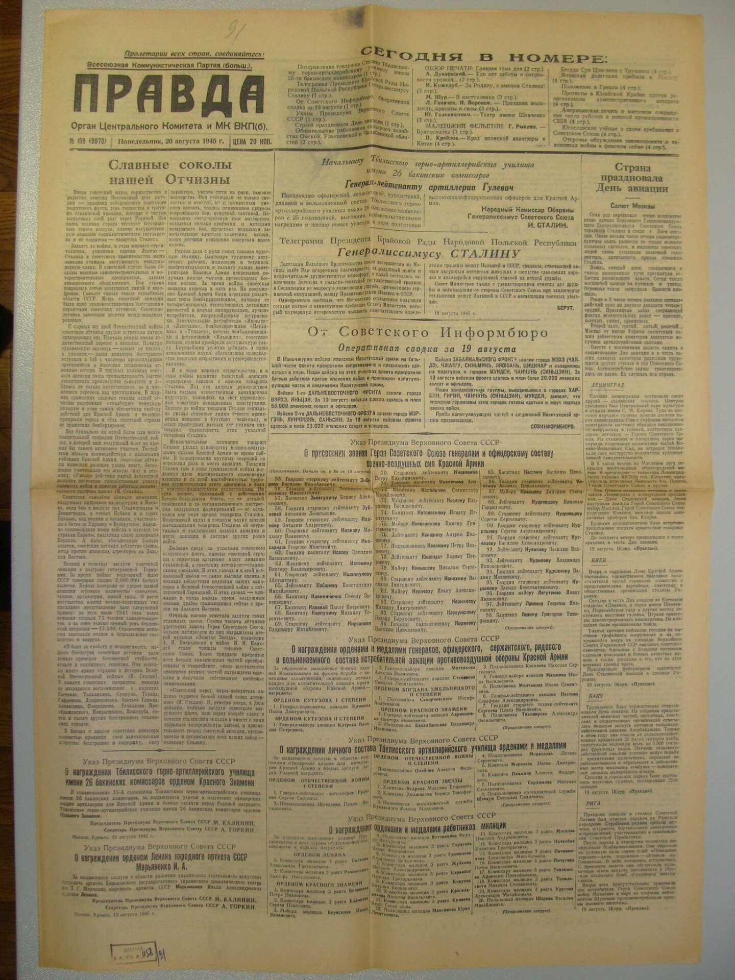 - Газета. Правда № 199 от 20 августа 1945 года. Фото : пресс-служба Музея Победы