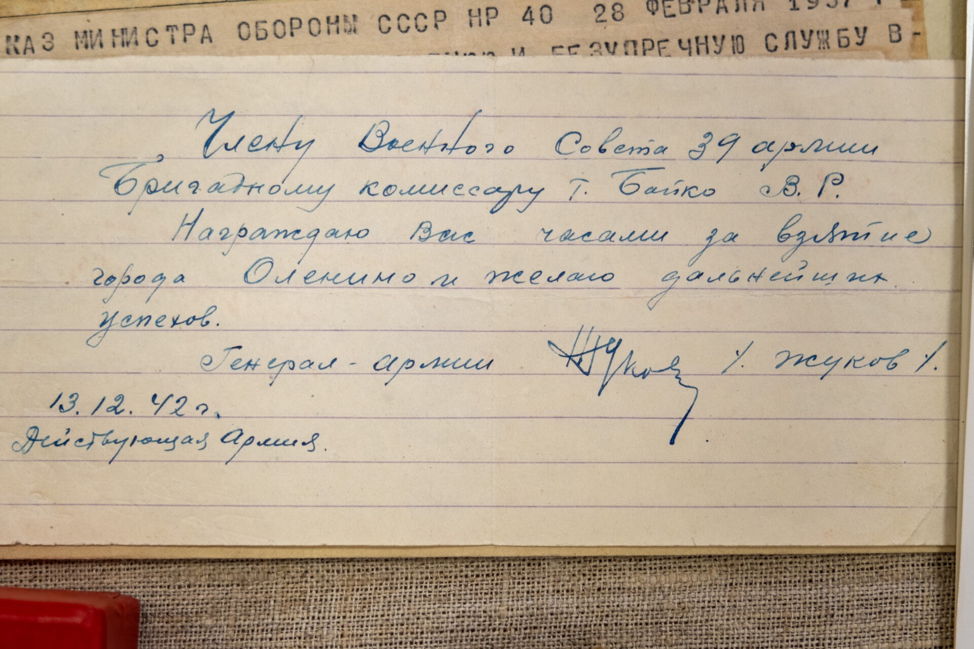Вера Рындич вместе с сыном Ильей и братом Василием передали в музей семейные фотографии, документы, два мундира со всеми наградами и другие личные вещи Героя Советского Союза. В числе реликвий – записка генерала армии Георгия Жукова о награждении Василий Бойко золотыми часами за взятие города Оленино.