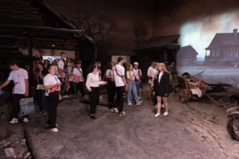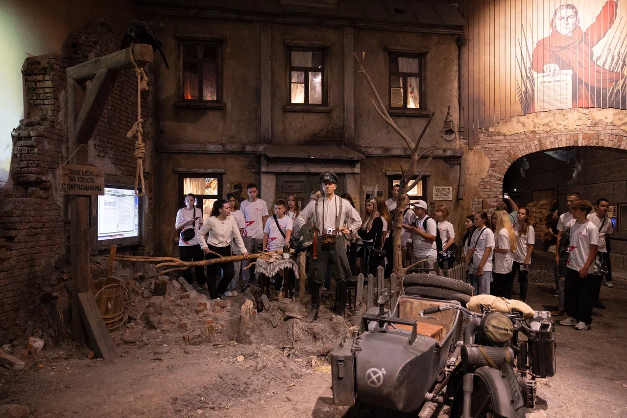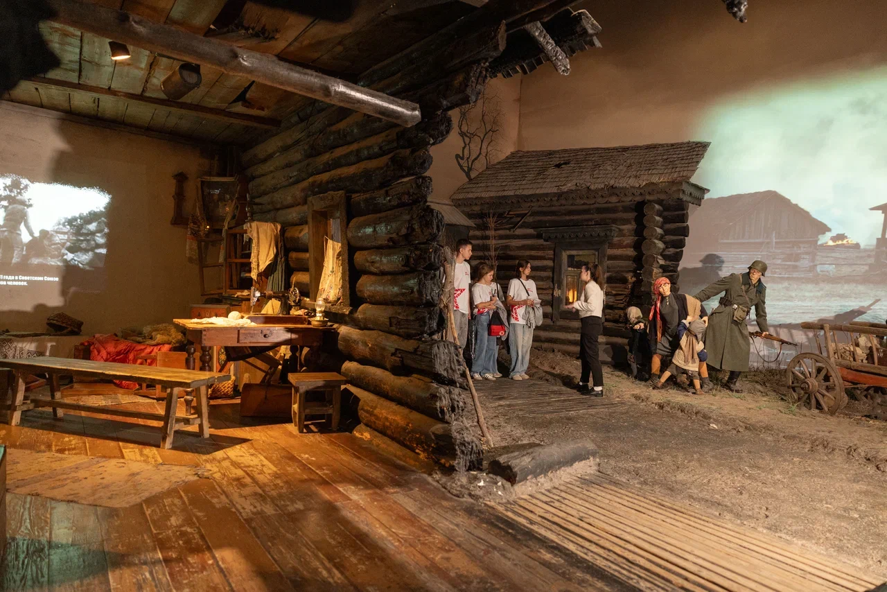 На экспозиции «Подвиг Народа», благодаря сочетанию панорам, исторически достоверных декораций, подлинных раритетов и мультимедийных технологий, ребята смогли погрузиться в события Великой Отечественной. Они «побывали» в Брестской крепости и на площади Великого Новгорода, заводском цеху и военном госпитале, сожженной смоленской деревне и библиотеке блокадного Ленинграда и на ступенях Рейхстага.