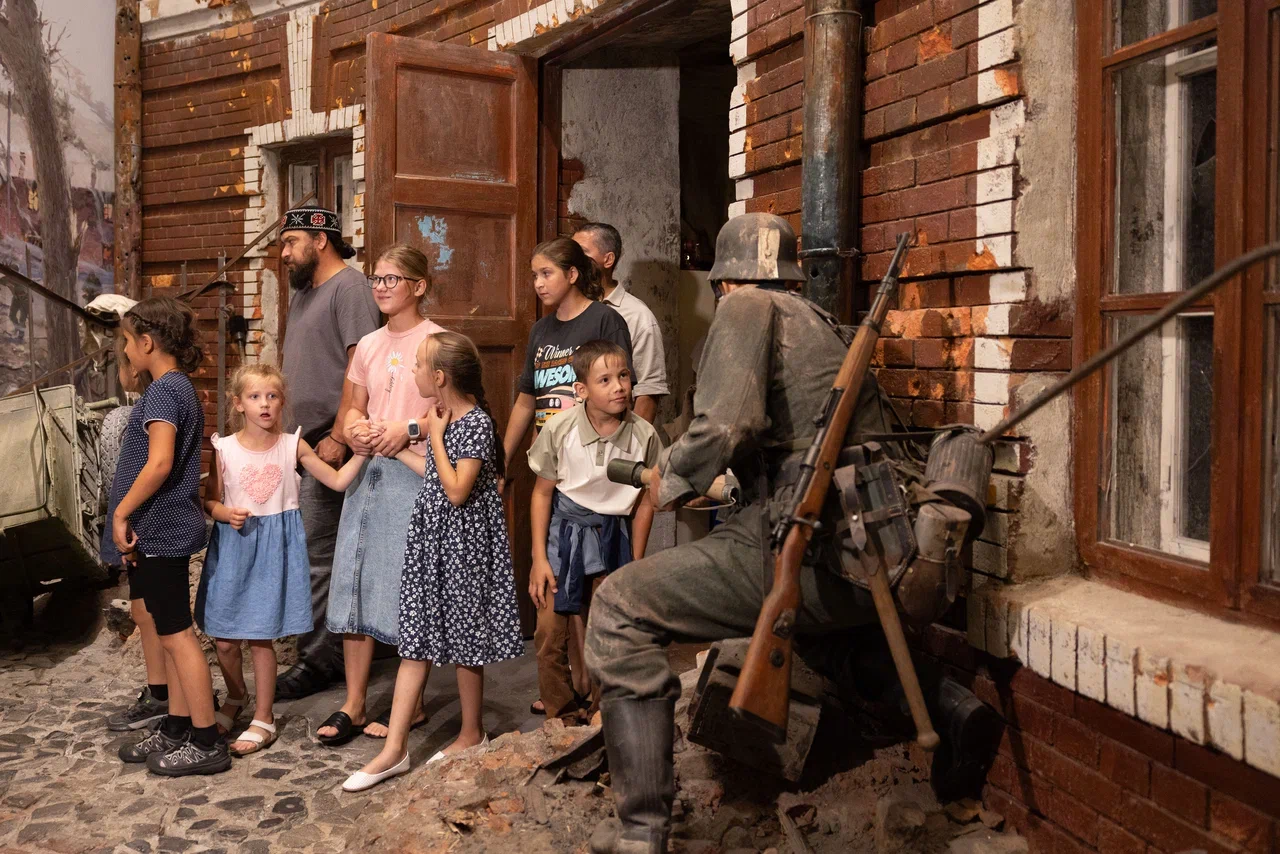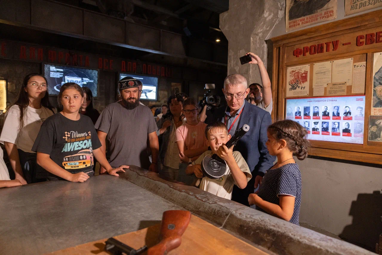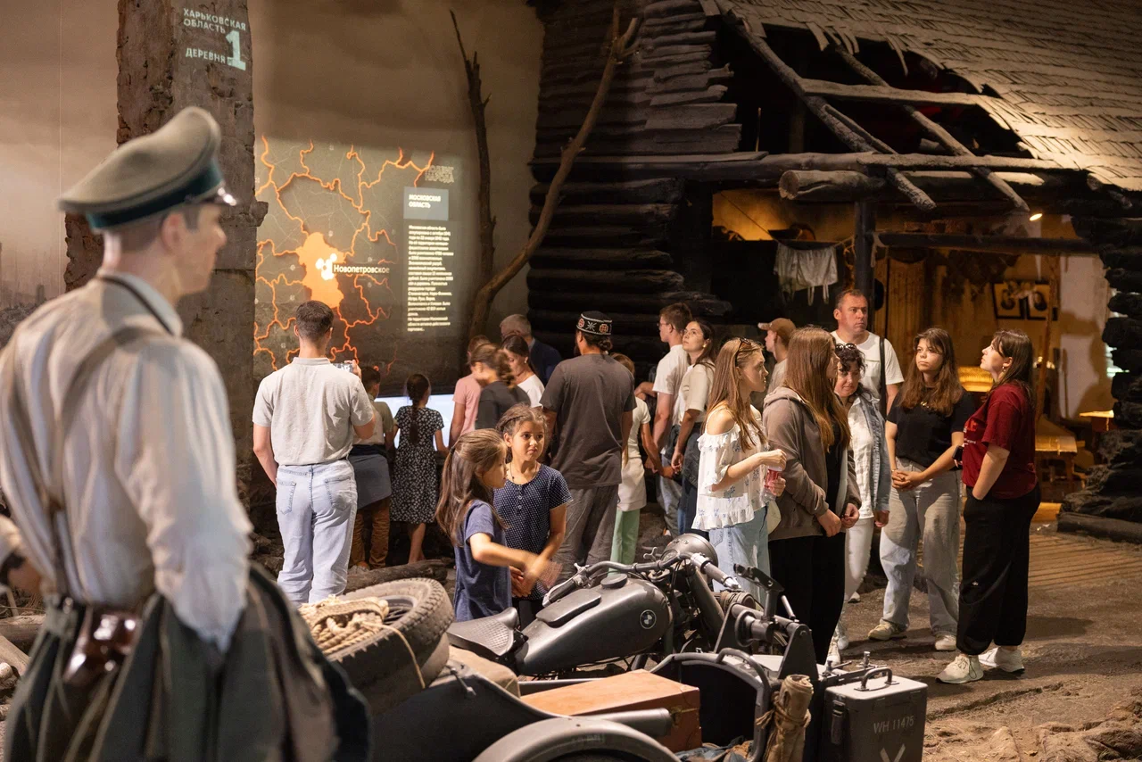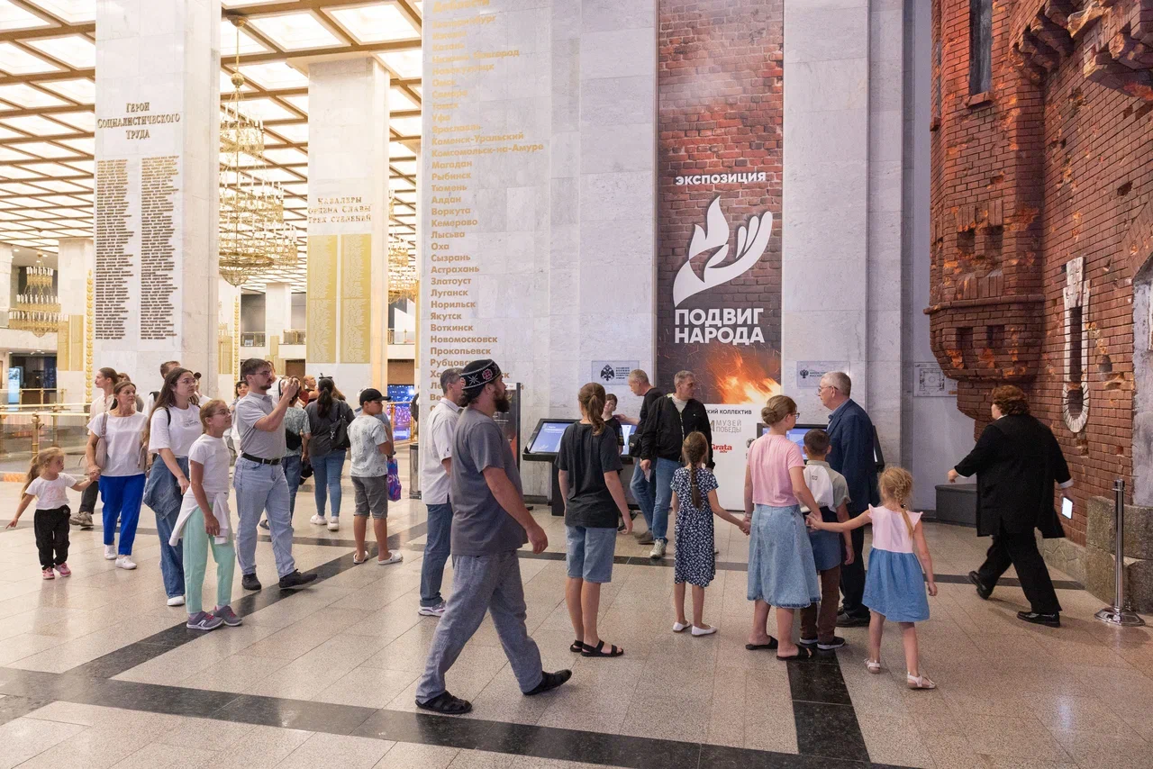 Музей Победы посетили семьи из девяти регионов России — всего более 100 человек. Они побывали на экскурсии по уникальной иммерсивной экспозиции «Подвиг Народа». Экскурсоводы рассказали о самых значимых событиях в истории Великой Отечественной войны, о том, как весь советский народ на фронте и в тылу приближал Великую Победу.