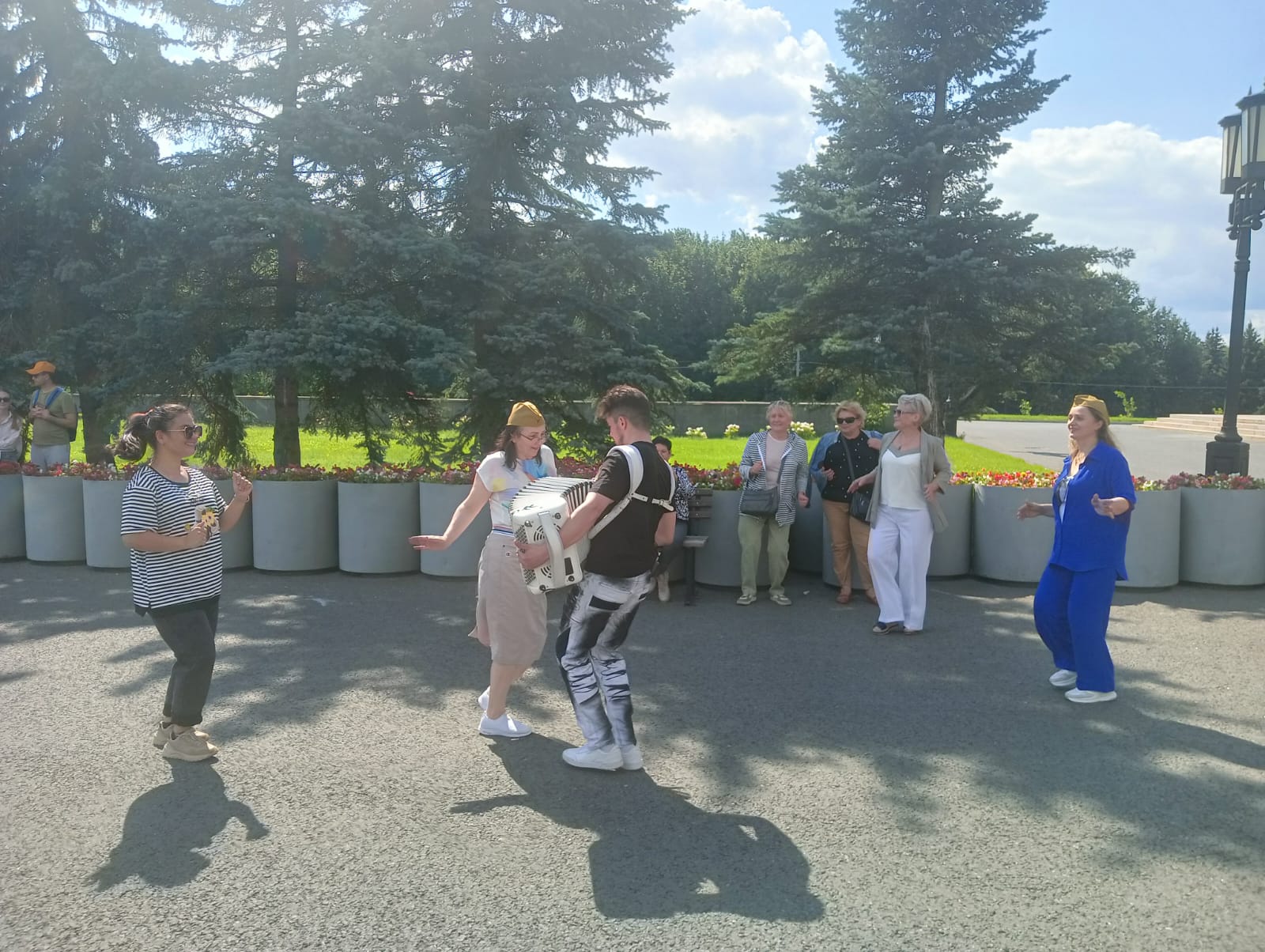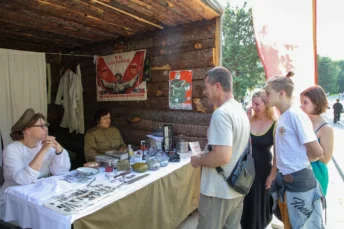 На площадке «Фронтовая агитбригада» выступили участники и победители Всероссийского фестиваля «Душа баяна», артисты продюсерского центра Voytenko.pro. Дуэт «Баян Микс» подарил гостям программы настоящий заряд бодрости и отличного настроения. Музыканты зажигательно исполнили известные песни военного времени — «Смуглянку», «Катюшу» и другие, а посетители спели и станцевали под любимые композиции.
