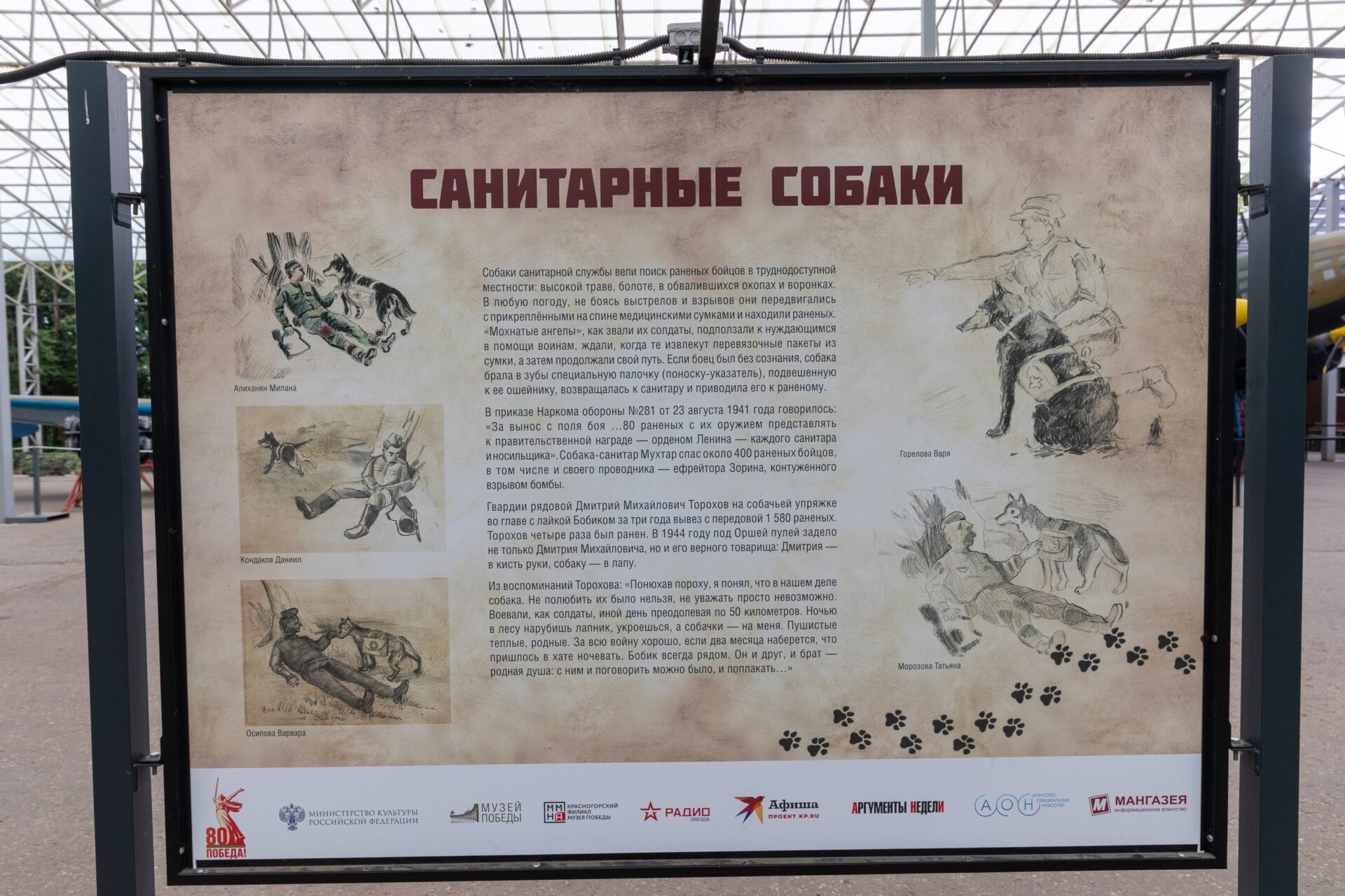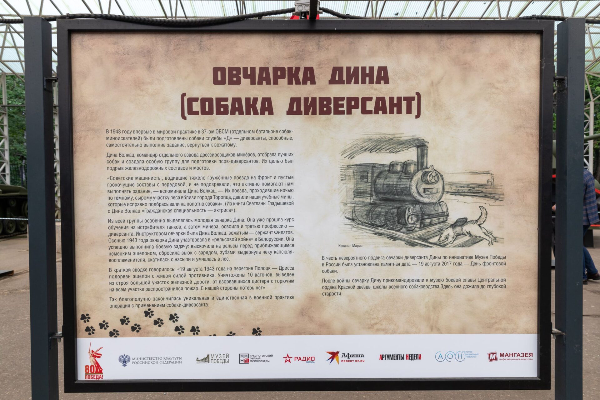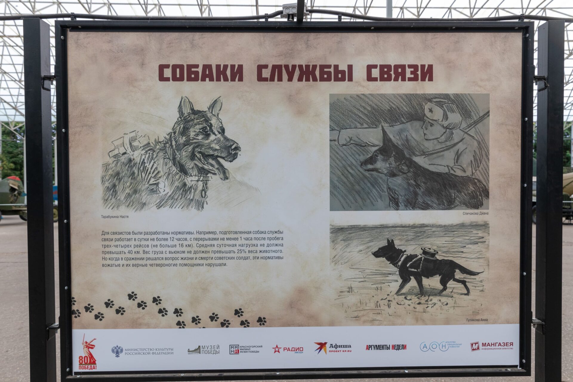 «Не все знают, что неоценимый вклад в Победу над гитлеровской Германией внесли собаки. Они бросались с взрывчаткой под вражеские танки, вывозили с поля боя тяжелораненых солдат, доставляли донесения под огнем противника, находили мины в труднодоступных местах и даже подрывали немецкие эшелоны. Более 60 тысяч мохнатых героев прошли боевой путь от Москвы до Берлина», — рассказали в Музее Победы.
