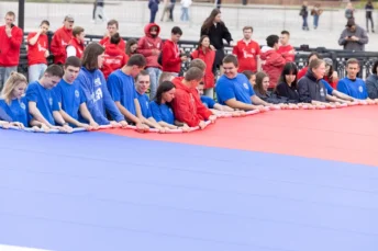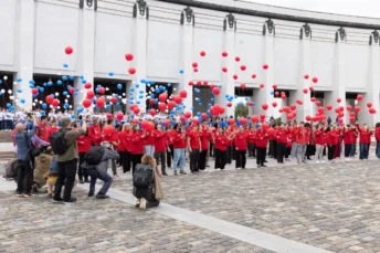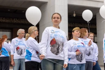 Участие в церемонии приняли представители волонтерских и молодежных организаций. Совместно они развернули масштабный триколор и выпустили в небо 400 воздушных шаров в цветах российского флага.