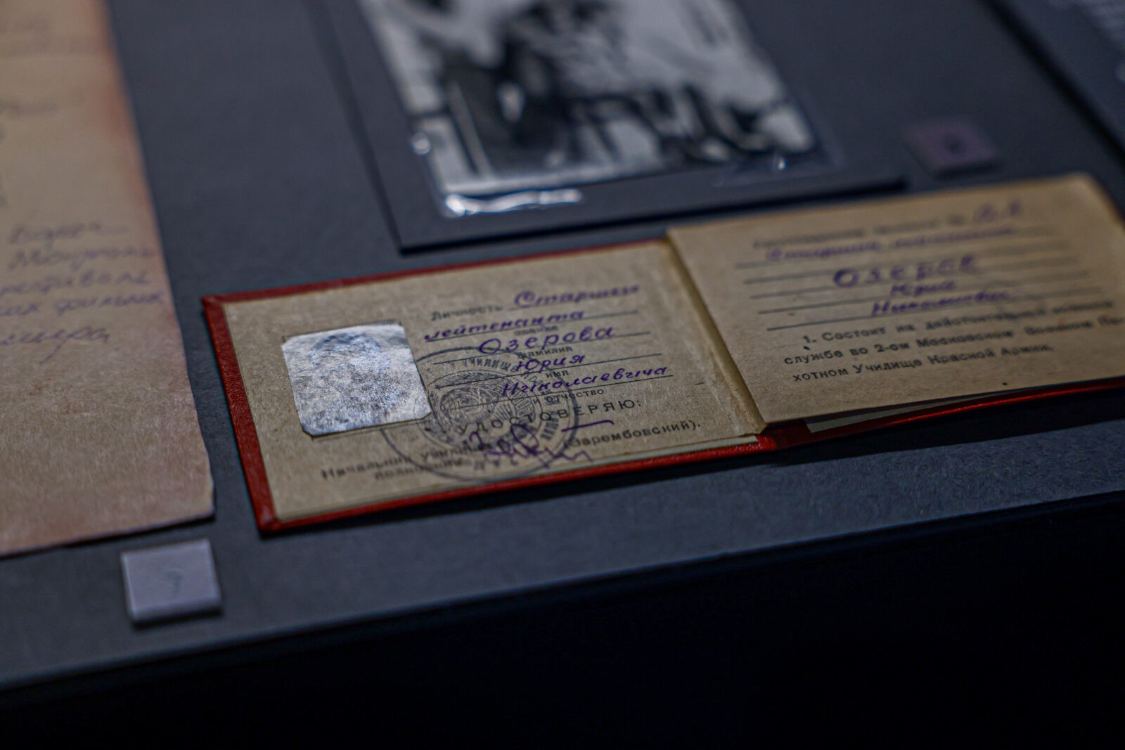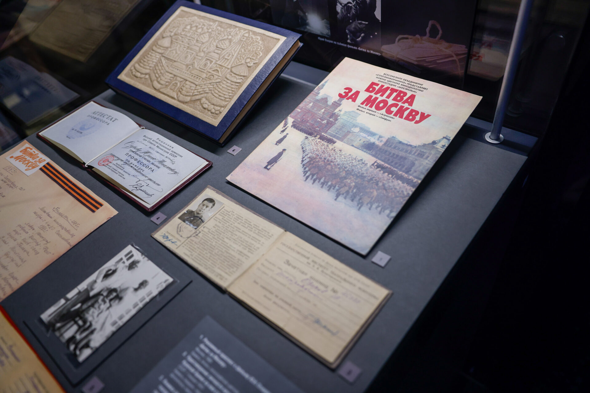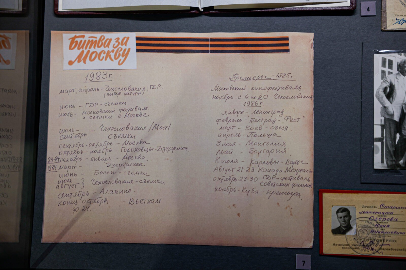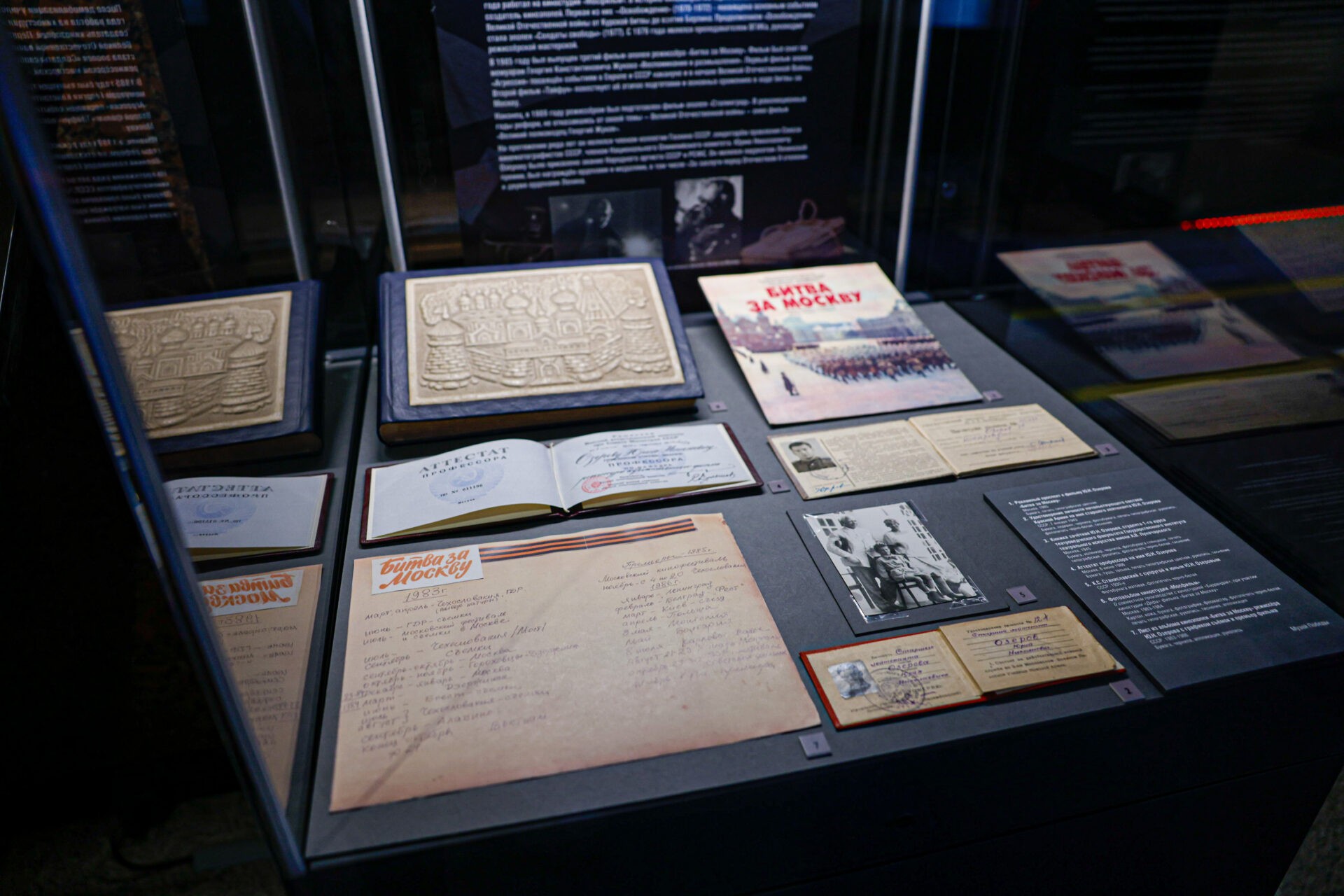 В выставку вошли предметы, переданные в дар Музею Победы вдовой режиссера Дилярой Керимовной Озеровой. Впервые широкой аудитории представили альбомы с газетными вырезками и фотографиями, посвященные съемкам и выпуску фильма «Битва за Москву». Гостям покажут уникальный фотоальбом киностудии «Мосфильм» о совместном производстве с киностудией «Баррандов» (Чехословакия), при участии киностудии «Дефа» (ГДР) фильма-эпопеи в 1983–1986 годах. Выставку дополнит лист из альбома киноэпопеи «Битва за Москву» с графиком съемок и премьер фильмов. В витрине также можно увидеть архивные фотографии и документы Юрия Озерова: удостоверение личности старшего лейтенанта, зачетную книжку ГИТИСа и аттестат профессора.