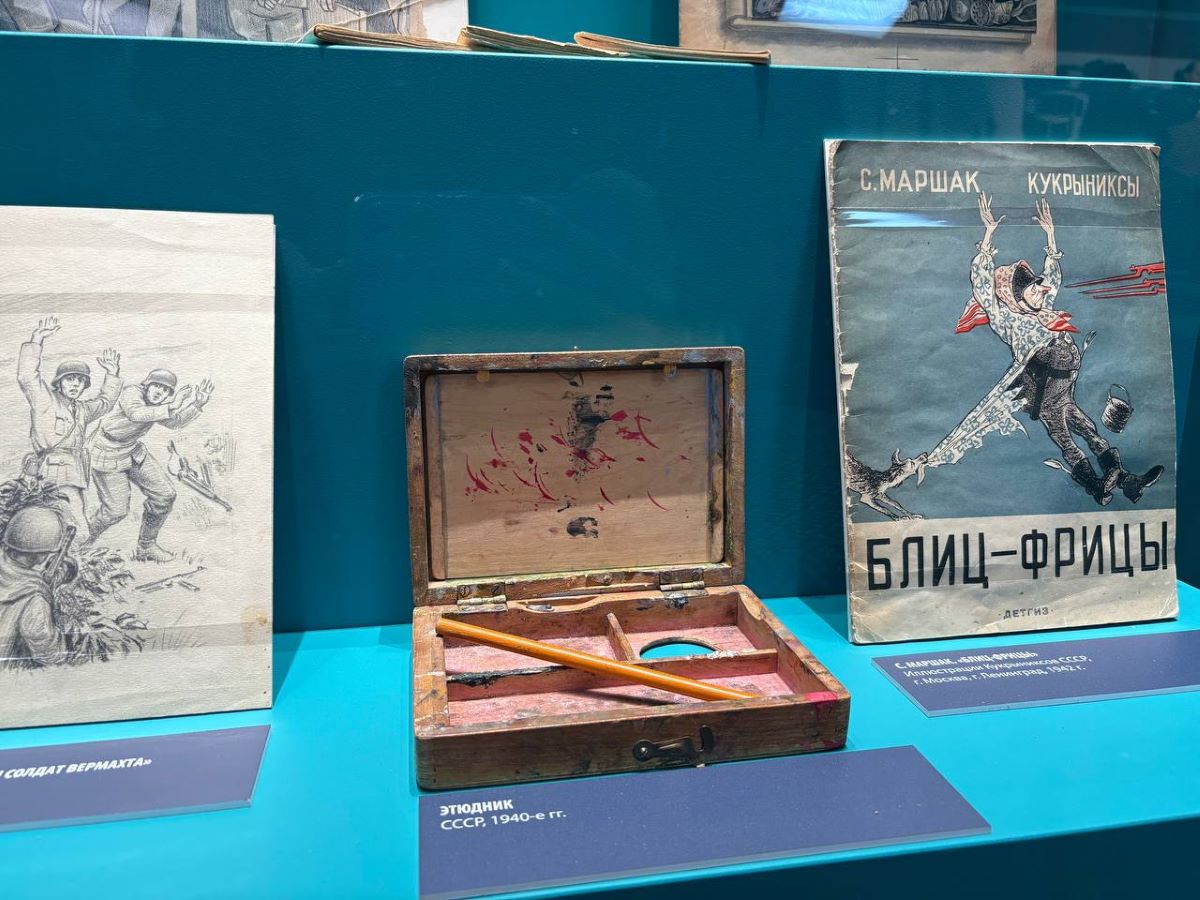 В экспозицию вошли свыше 170 реликвий. Среди уникальных предметов — фронтовые зарисовки художника Николая Жукова, листовки на финском языке по эскизам Бориса Пророкова, альбом с рисунками «Лагерный крокодил», созданный немецкими военнопленными по аналогии с известным советским сатирическим журналом, карта Генерального штаба Красной Армии «Дрогобыч-6», принадлежавшая майору государственной безопасности, командиру интернационального отряда партизан-диверсантов Сергею Волокитину.