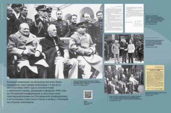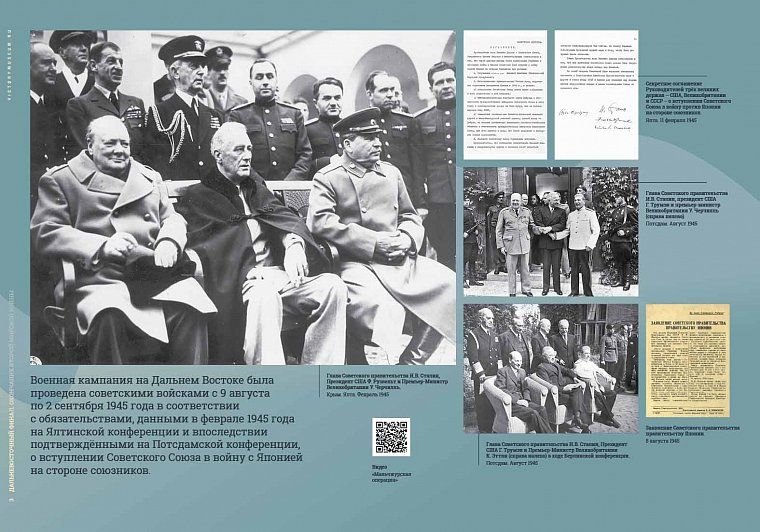 Часть выставочных планшетов дополнена QR-кодами, используя которые, зрители смогут посмотреть редкие кадры кинохроники. Фронтовые кинооператоры запечатлели бои во время Маньчжурской операции, освобождения Курил и Северной Кореи, также в подборку вошли кадры момента подписания Японией акта о капитуляции на борту линкора «Миссури».