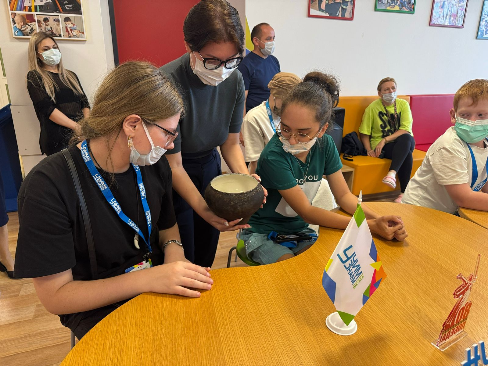 Кроме того, состоялась экскурсия от юных историков: специально подготовленные экскурсоводы, ученики ГБОУ школы № 158 из числа участников Детского общественного совета Музея Победы провели для ребят экскурсию по выставке. Дети, находящиеся на длительном лечении, также приняли участие в мастер-классе по народному творчеству. Под руководством школьников они раскрасили деревянные заготовки, познакомившись с различными стилями русского декоративно-прикладного искусства.