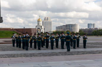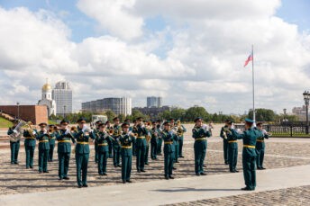 Возле колоннады Музея Победы выступил военный оркестр штаба Центрального Оршанско-Хинганского ордена Жукова Краснознаменного округа войск национальной гвардии Российской Федерации.