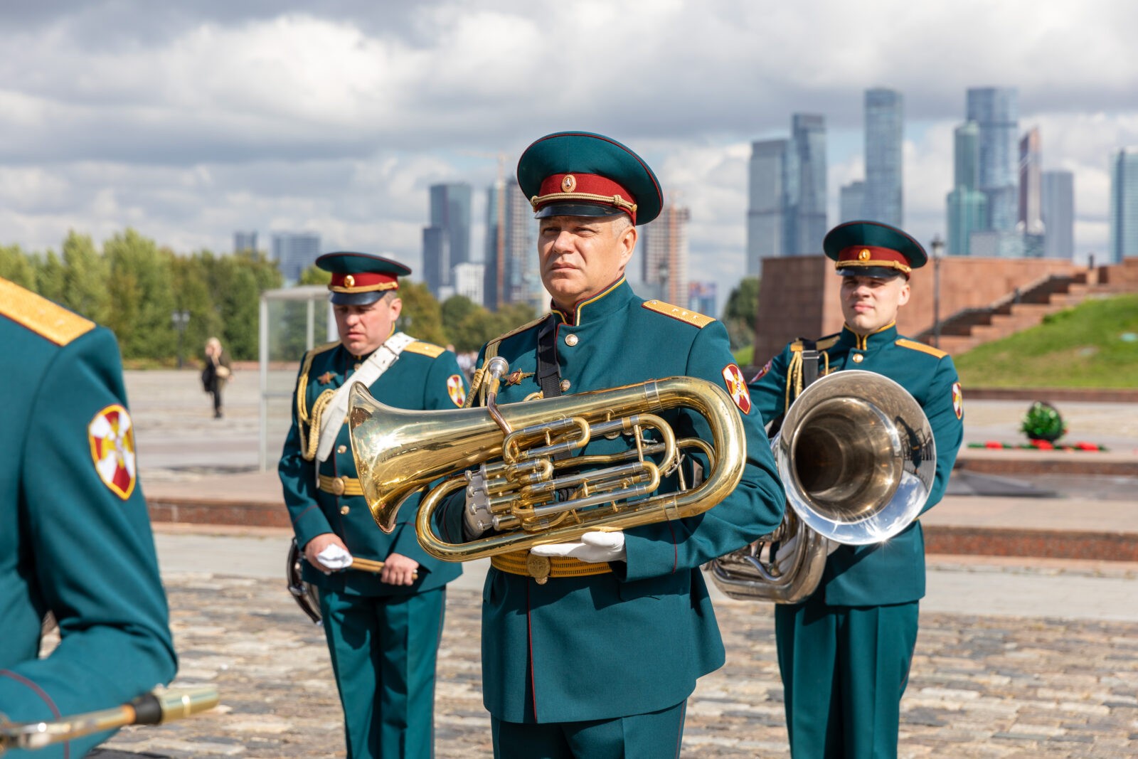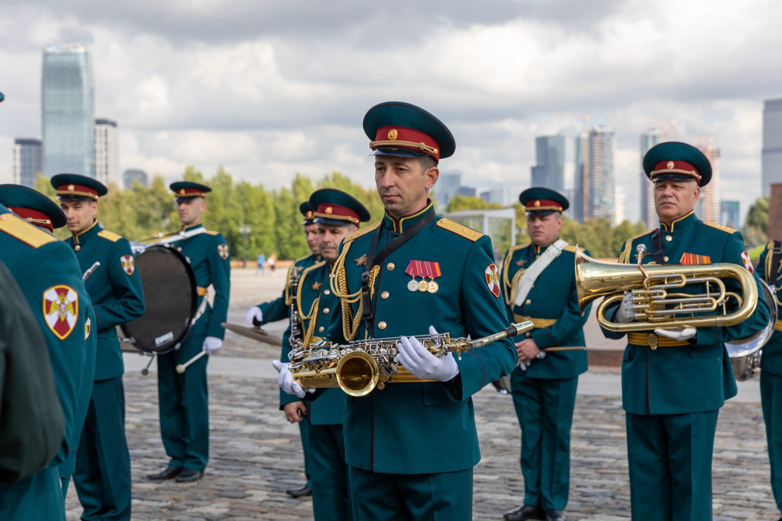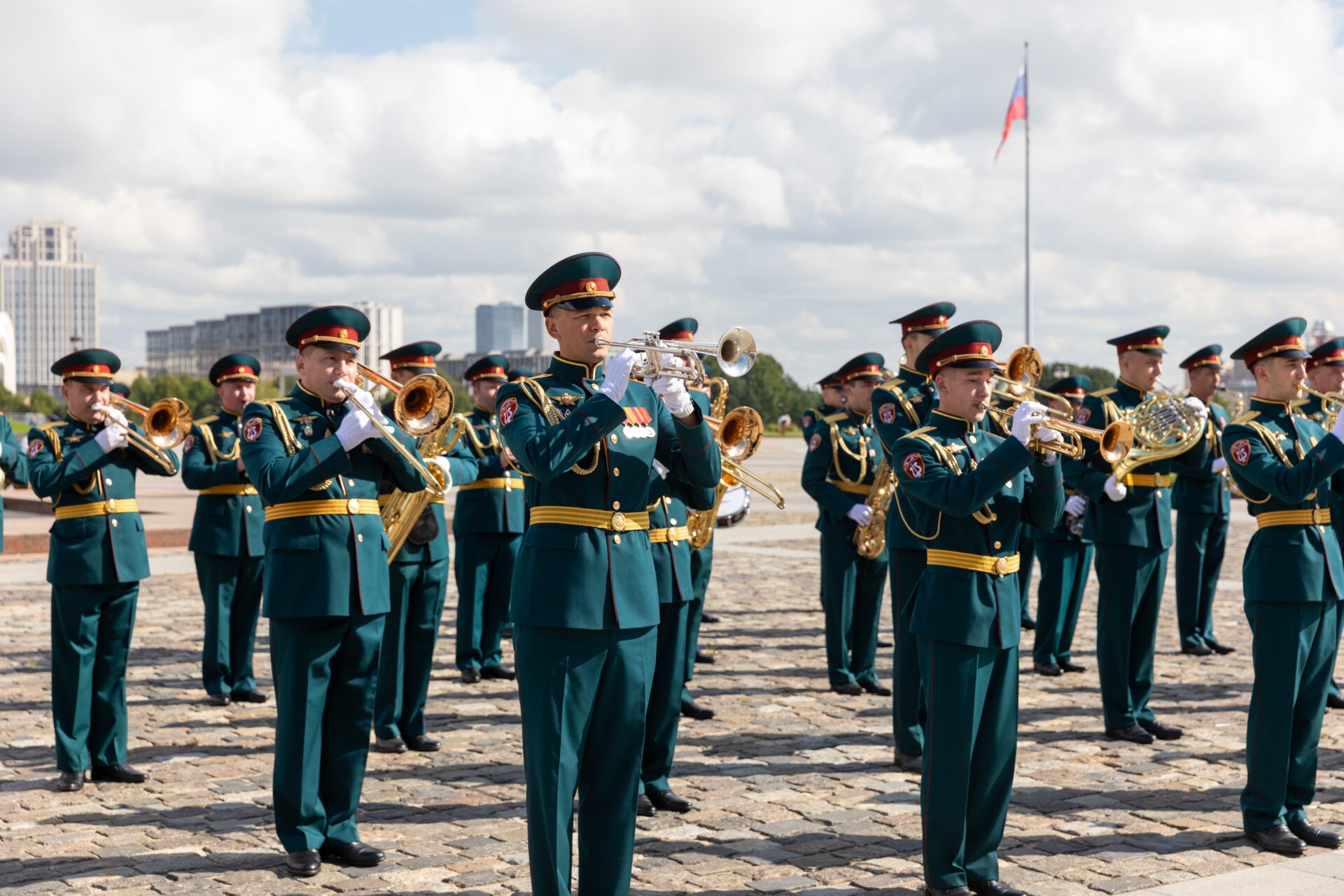 Возле колоннады Музея Победы выступил военный оркестр штаба Центрального Оршанско-Хинганского ордена Жукова Краснознаменного округа войск национальной гвардии Российской Федерации.