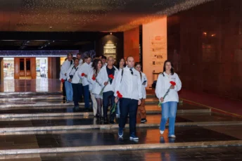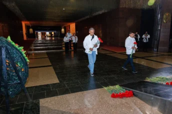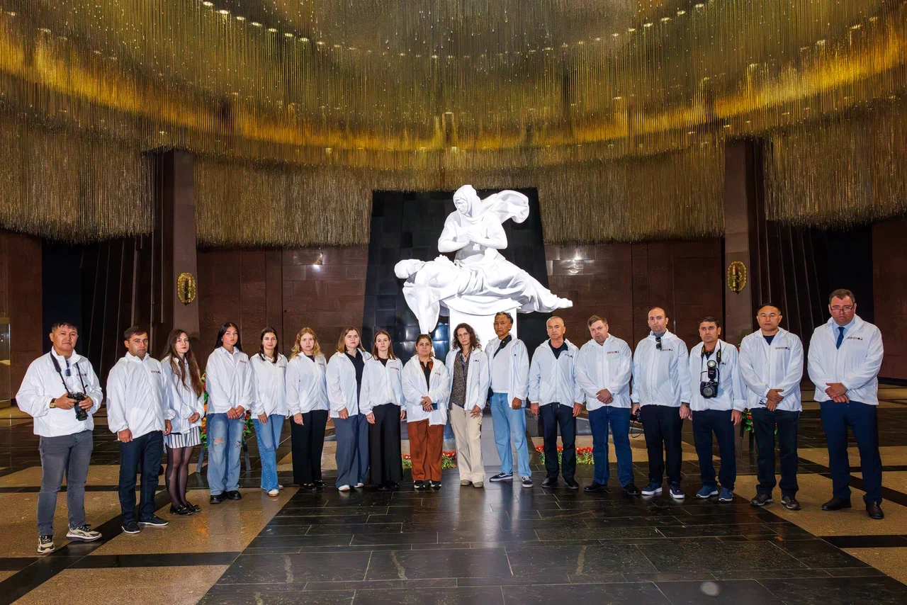 Музей Победы посетили журналисты из Белоруссии, Армении, Казахстана и других стран СНГ. В ходе визита они возложили цветы к скульптуре «Скорбь» в Зале Памяти и Скорби и пообщались с генеральным директором Музея Победы Александром Школьником.