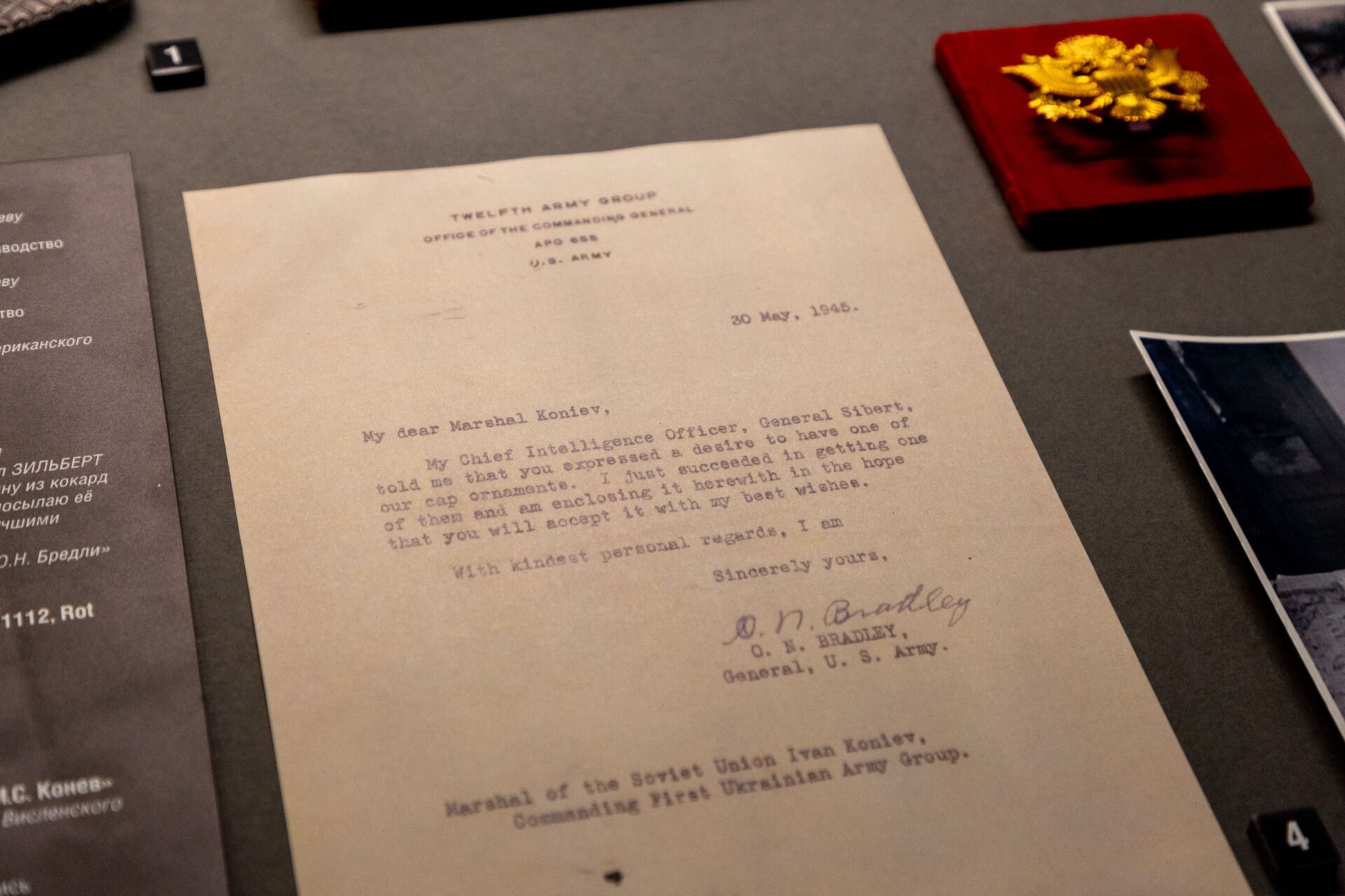 В выставку вошло около 20 подлинных раритетов из фондов музея на Поклонной горе. Эти реликвии были переданы в музей супругой маршала Антониной Коневой и дочерью Наталией Ивановной. Гости увидят личные вещи маршала — очки и футляр для них, штабной портфель, принадлежавший Ивану Степановичу, офицерскую кокарду американской армии, подаренную в числе других подарков американским генералом Омаром Брэдли. Экспозицию дополнят архивные документы и фотографии, в том числе именной бланк Ивана Степановича Конева с автографом, и схема штурма Берлина войсками 1-го Украинского фронта из личного архива маршала.