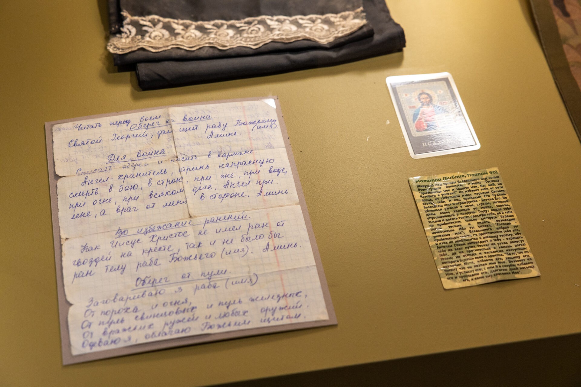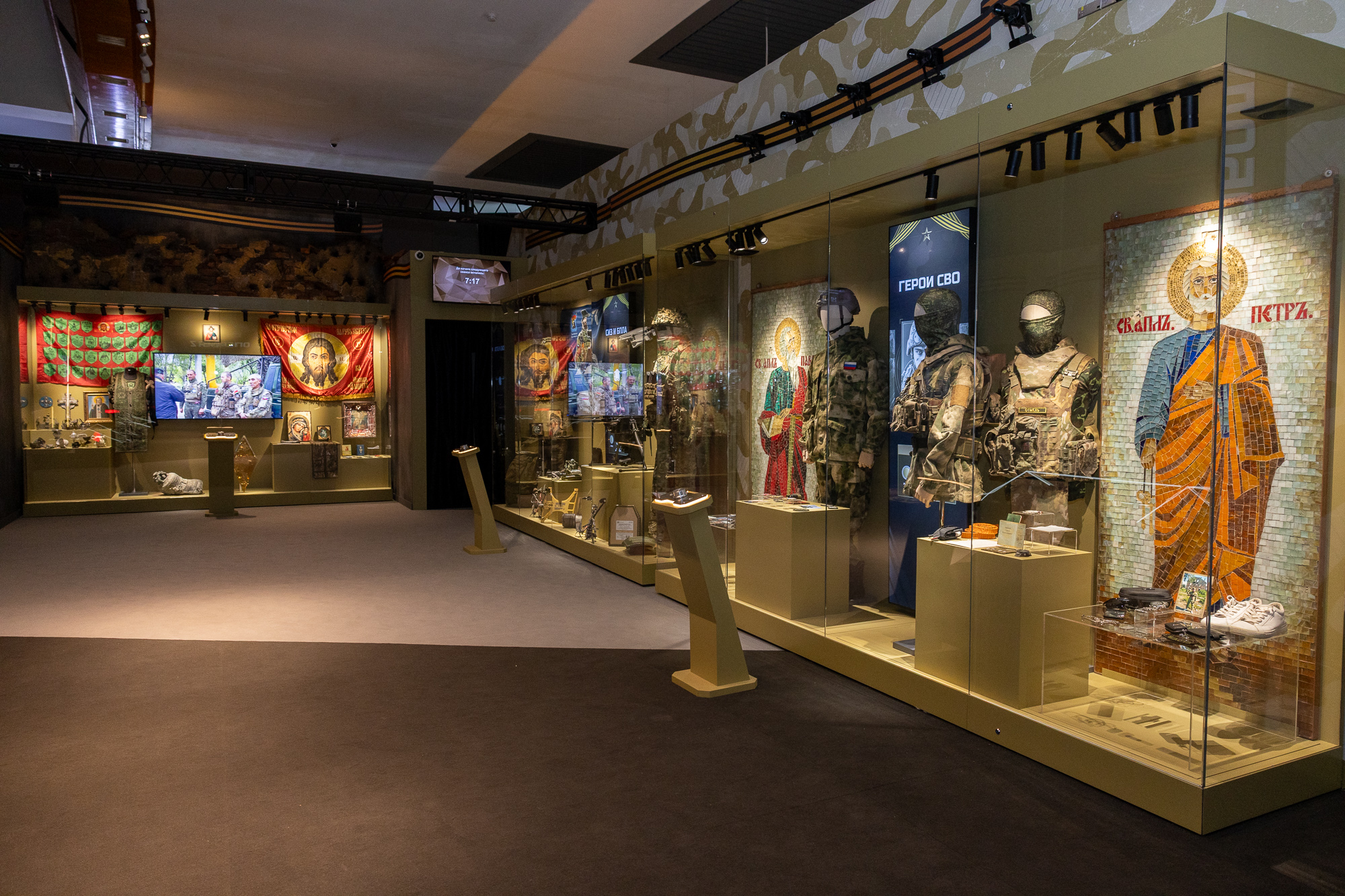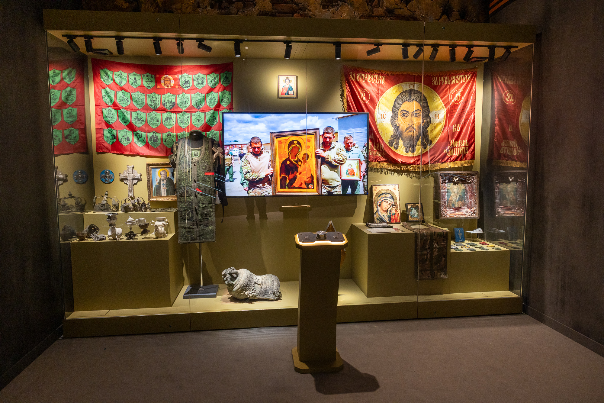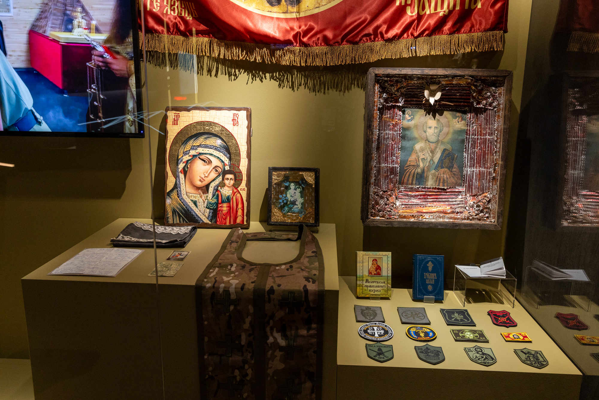 В экспозиции также представлены предметы церковной утвари и материалы о деятельности военного духовенства. Среди них — фрагмент позолоченного покрытия купола главного собора Успенского Николо-Васильевского монастыря и расплавленный колокол, разрушенный в ходе боевых действий под Угледаром. Посетители также могут увидеть произведения современных живописцев Студии военных художников имени М. Б. Грекова, посвященные событиям специальной военной операции.