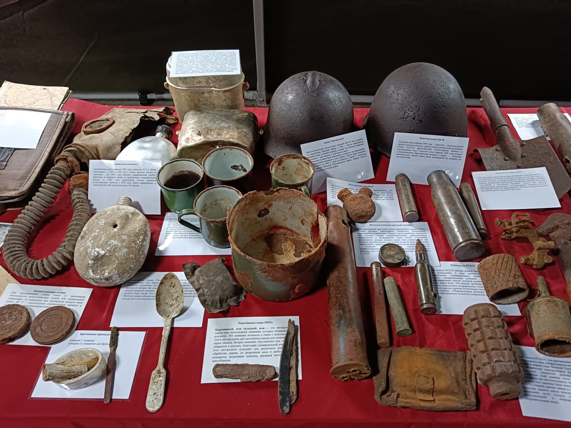 Посетители выставки могли ознакомиться с артефактами, найденными в местах боев Великой Отечественной войны в Калужской области и узнать о судьбах найденных защитников Отечества.