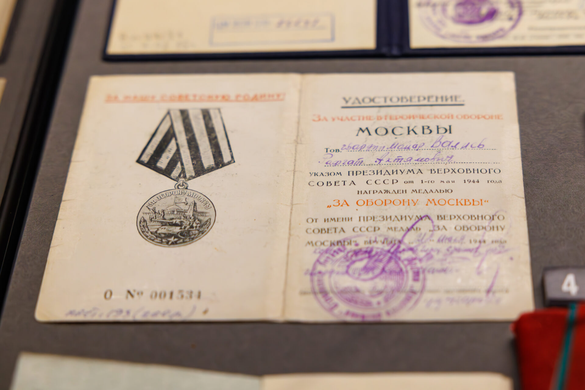 «На выставке «Семейные реликвии» представлены предметы, переданные в дар Музею Победы дочерью ополченца Викторией Рафгатовной Валиевой. Среди уникальных экспонатов — медаль «За оборону Москвы», знак «Народное ополчение Москвы» и удостоверения к ним, орденская книжка, принадлежавшие Рафгату Валиеву», — рассказали в Музее Победы.