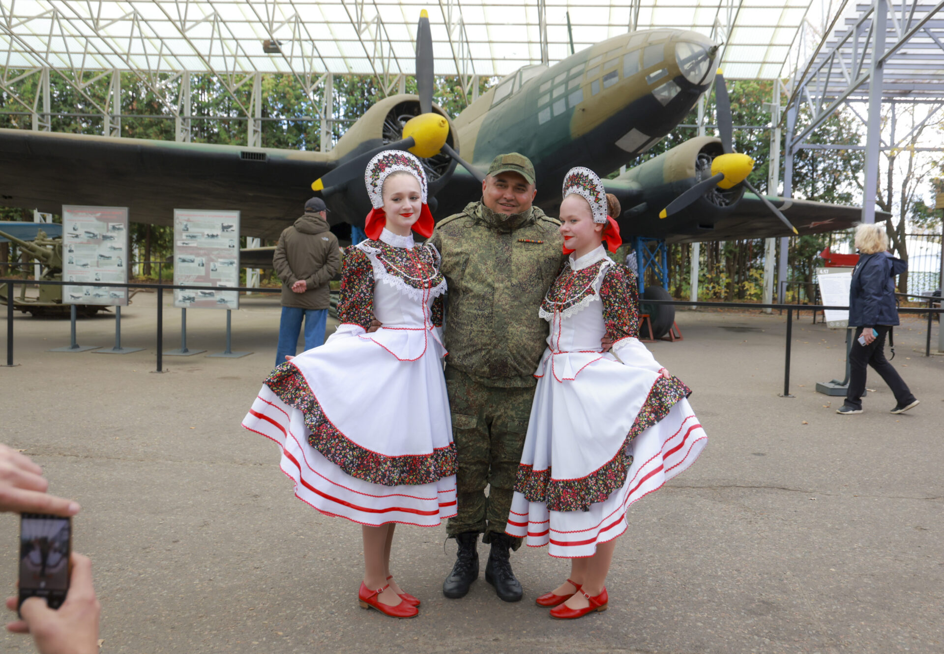 «Мы танцуем в хореографическом коллективе «Ассорти» вместе с солисткой Татьяной Бабкиной. С ней мы представляем два номера: «От души» и «Москва Златоглавая». А сейчас будем танцевать свой сольный номер. Это русские народные танцы. Нам все очень нравится — и военные тут, и техника представлена, и окопы мы видели. Очень трепетная атмосфера сегодня! Приедем сюда еще», — поделилась участница коллектива Алина Чиненкова.