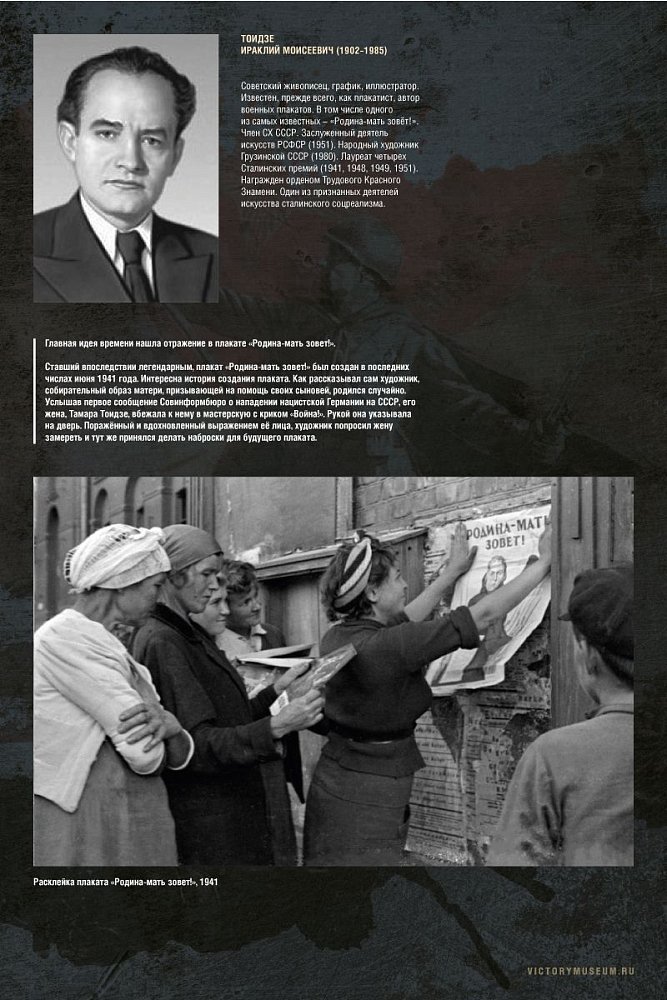 «В годы войны искусство объединяло народ единой целью в борьбе против врага. И плакаты стали самыми массовыми в искусстве военного времени. Они выступали не только как агитационные и мотивационные средства, но и как информационные — наглядно демонстрируя необходимые и правильные действия в условиях войны», — отметили в Музее Победы.