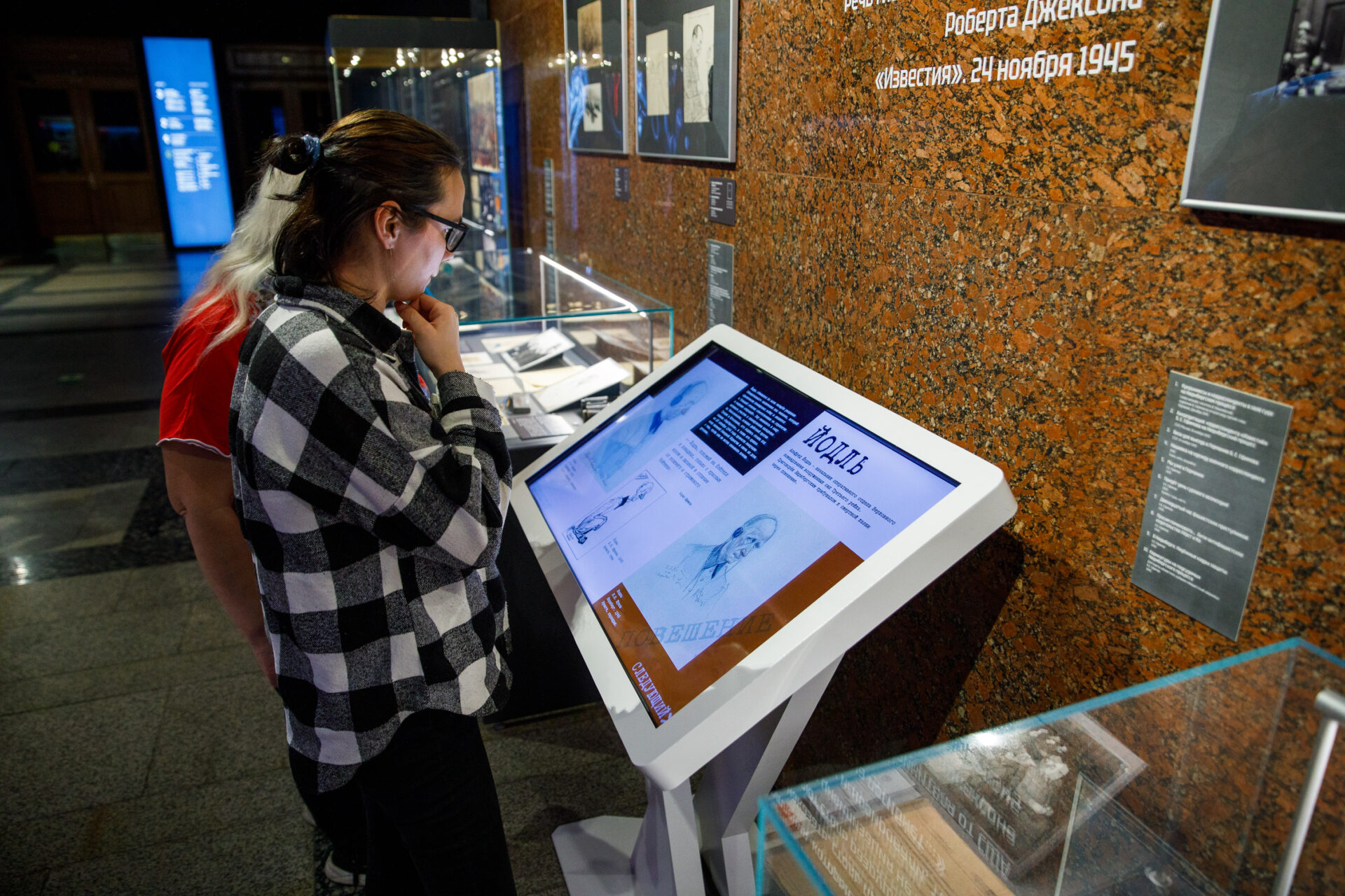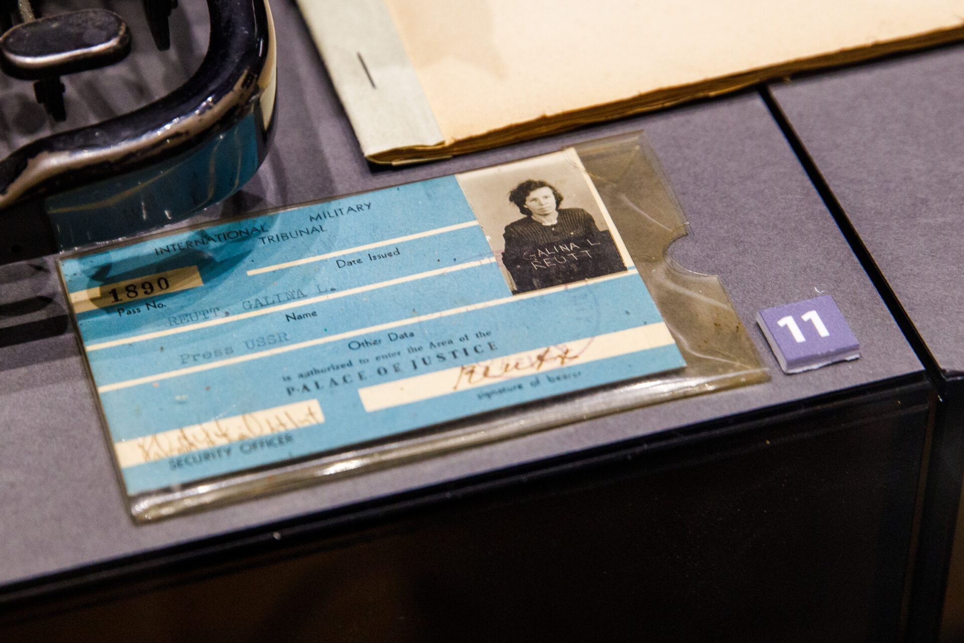 Разделы выставки рассказывают о работе Международного военного трибунала – заседаниях суда, членах советской делегации. Это фотографии, документы, подборка фрагментов газет и т.д. В экспозиции также представлены подлинные предметы, принадлежавшие членам советской делегации, работавшим в Нюрнберге, например, записные книжки корреспондента ТАСС Галины Хромушиной. Посетители могут увидеть фотографии Евгения Халдея и Виктора Тёмина, снимавших судебный процесс.