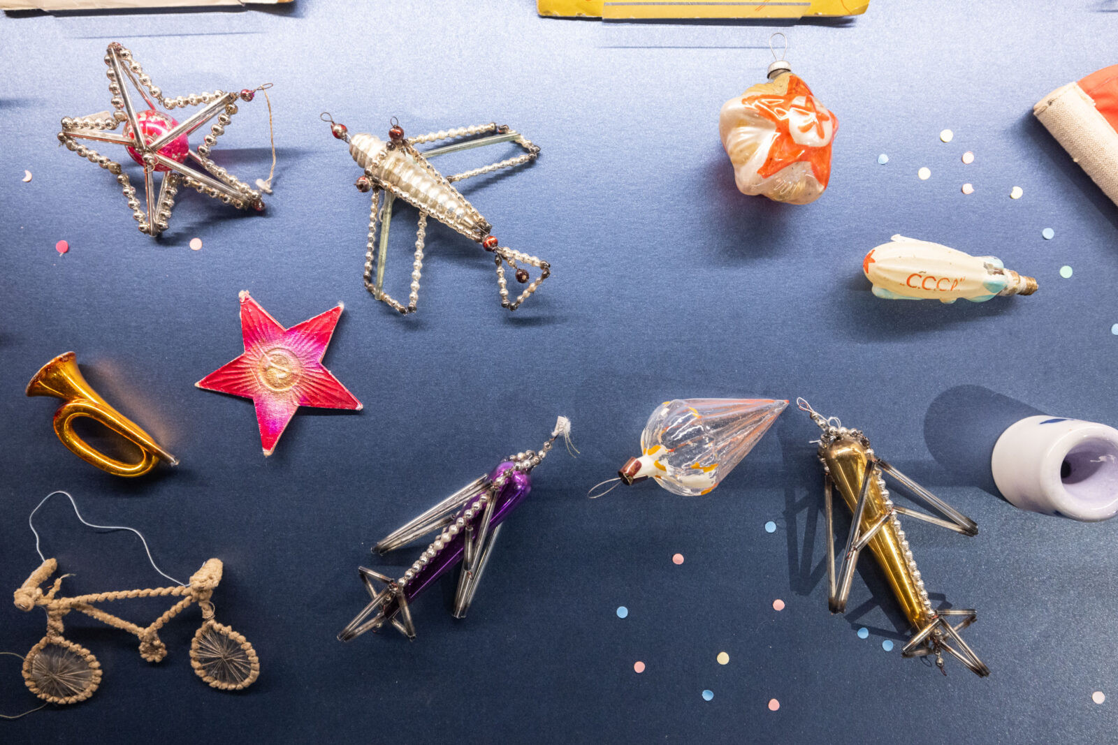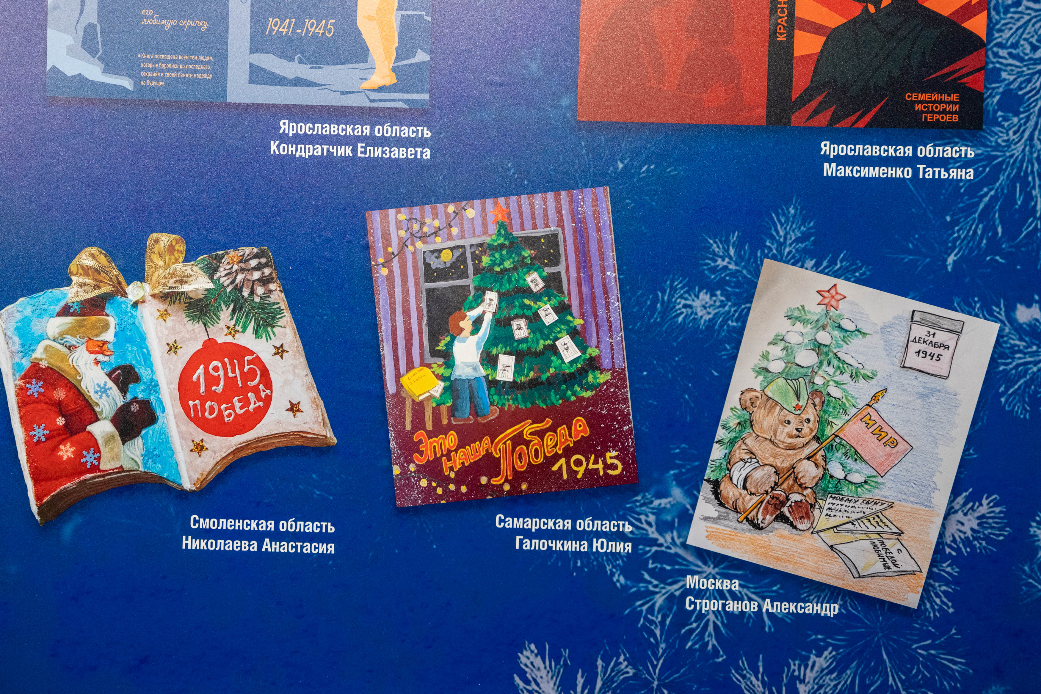 Частью выставки стали работы победителей Международного конкурса рисунков «Нарисуй Ёлку Победы» в номинации «Книжная обложка» Российской государственной детской библиотеки и лучшие самодельные елочные украшения номинации «Новогодняя игрушка 1945 года».